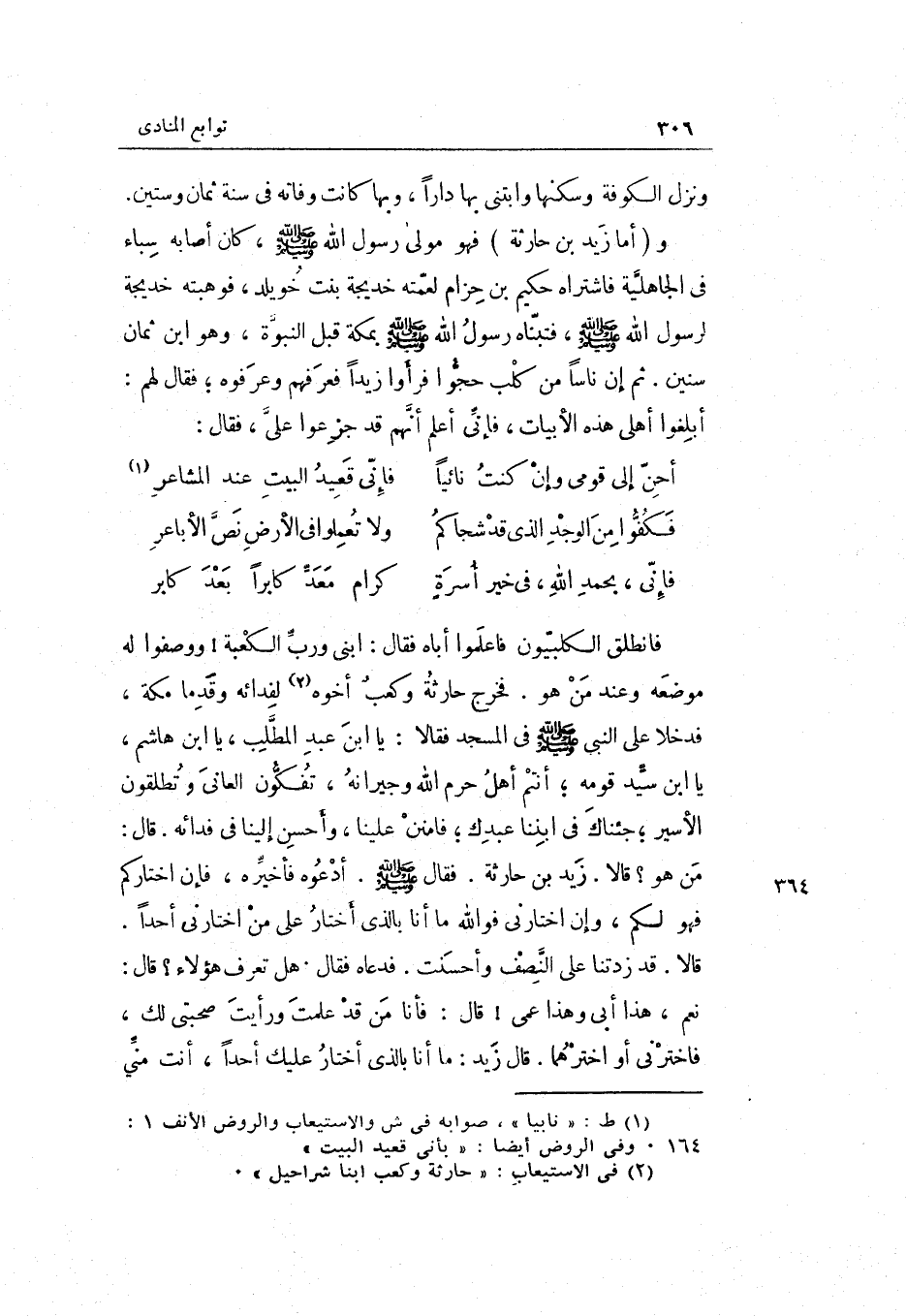 وَأما زيد بن حَارِثَة فَهُوَ مولى رَسُول الله صَلَّى اللَّهُ عَلَيْهِ وَسَلَّم َ كَانَ أَصَابَهُ سباء فِي الْجَاهِلِيَّة فَاشْتَرَاهُ حَكِيم بن حزَام لِعَمَّتِهِ خَدِيجَة بنت خويلد فَوَهَبته خَدِيجَة لرَسُول الله صَلَّى اللَّهُ عَلَيْهِ وَسَلَّم َ فَتَبَنَّاهُ رَسُول الله صَلَّى اللَّهُ عَلَيْهِ وَسَلَّم َ بِمَكَّة قبل النُّبُوَّة وَهُوَ ابْن ثَمَان سِنِين. ثمَّ إِن نَاسا من كلب حجُّوا فَرَأَوْا زيدا فعرفهم وعرفوه فَقَالَ لَهُم: أبلغوا أَهلِي هَذِه الأبيات فَإِنِّي أعلم أَنهم قد جزعوا عَليّ فَقَالَ: