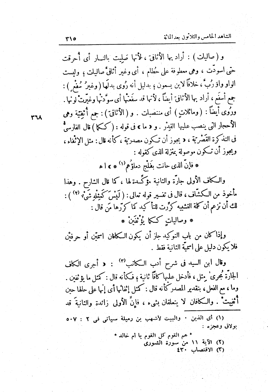 وَيجوز أَن تكون مَوْصُولَة بِمَنْزِلَة الَّذِي كَقَوْلِه: فَإِن الَّذِي حانت بفلج دِمَاؤُهُمْ ا. هـ وَالْكَاف الأولى جَارة وَالثَّانيَِة مُؤَكدَة لَهَا كَمَا قَالَ الشَّارِح. وَهَذَا مَأْخُوذ من الْكَشَّاف قَالَ فِي تَفْسِير قَوْله تَعَالَى: لَيْسَ كمثله شيءٌ: لَك أَن تزْعم أَن كلمة التَّشْبِيه كررت للتَّأْكِيد كَمَا كررها من قَالَ: وصاليات ككما يؤثفين وَإِذا كَانَ من بَاب التوكيد جَازَ أَن يكون الكافان اسْمَيْنِ أَو حرفين فَلَا يكون دَلِيل على اسمية الثَّانِيَة فَقَط.