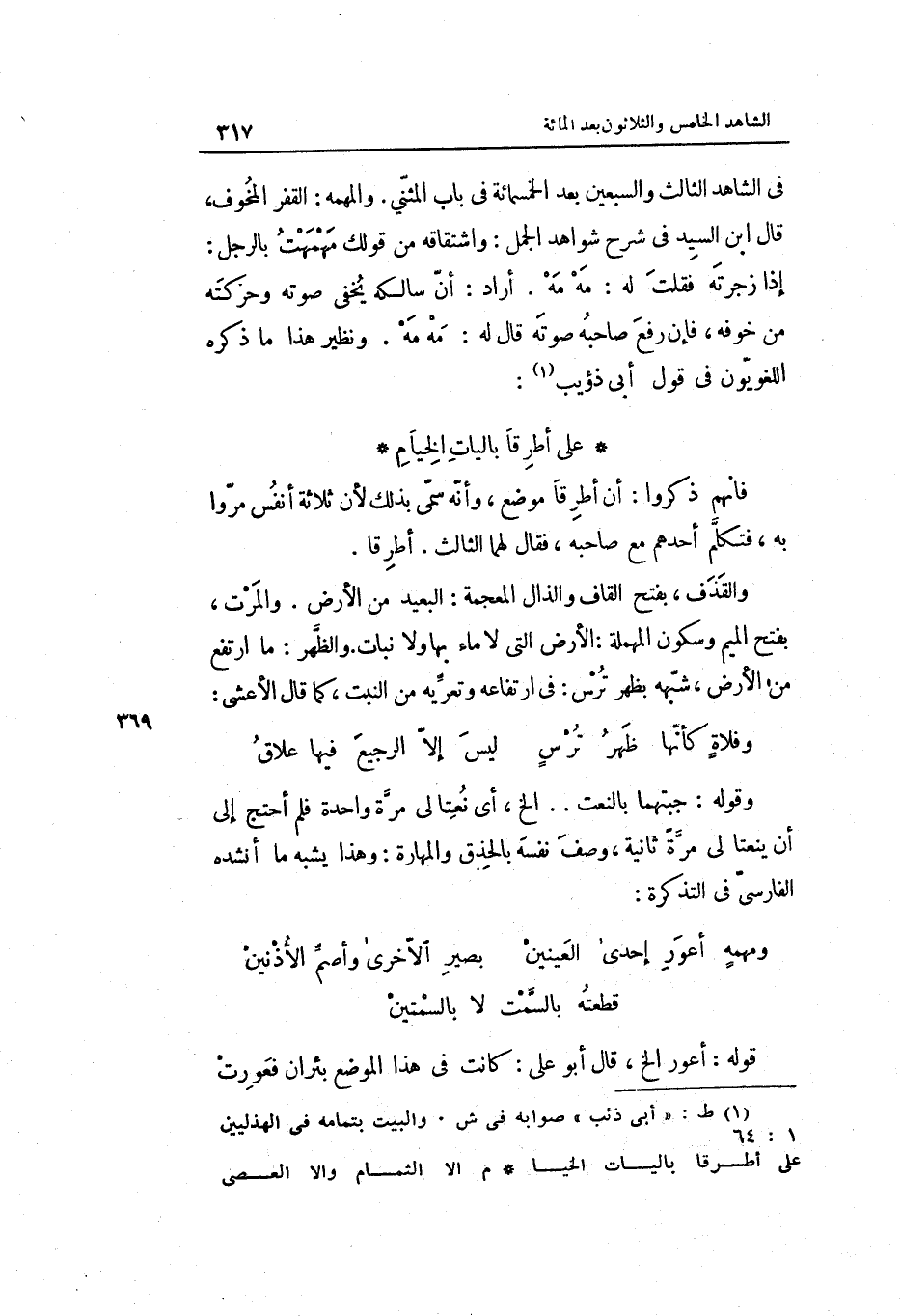 فِي الشَّاهِد الثَّالِث وَالسبْعين بعد الْخَمْسمِائَةِ فِي بَاب الْمثنى. والمهمة: القفر الْمخوف قَالَ ابْن السَّيِّد فِي شرح شَوَاهِد الْجمل: واشتقاقه من قَوْلك مهمهت بِالرجلِ: إِذا زجرته فَقلت لَهُ: مَه مَه. أَرَادَ: أَن سالكه يخفي صَوته وحركته من خَوفه فَإِن رفع صَاحبه صَوته قَالَ لَهُ: مَه مَه. وَنَظِير هَذَا مَا ذكره اللغويون فِي قَول أبي ذُؤَيْب: على أطرقا باليات الْخيام فَإِنَّهُم ذكرُوا: أَن أطرقا مَوضِع وَأَنه سمي بذلك لِأَن ثَلَاثَة أنفس مروا بِهِ فَتكلم أحدهم مَعَ صَاحبه فَقَالَ لَهما الثَّالِث. أطرقا. والْقَذْف بِفَتْح الْقَاف والذال الْمُعْجَمَة: الْبعيد من الأَرْض. والمرت بِفَتْح الْمِيم وَسُكُون الْمُهْملَة: الأَرْض الَّتِي لَا مَاء بهَا وَلَا نَبَات. والظّهْر: مَا ارْتَفع من الأَرْض شبهه بِظهْر ترس: فِي ارتفاعه وتعريه من النبت كَمَا قَالَ الْأَعْشَى: وَقَوله: جبتهما بالنعت. . الخ أَي: نعتا لي مرّة وَاحِدَة فَلم أحتج إِلَى أَن ينعتا لي مرّة ثَانِيَة)