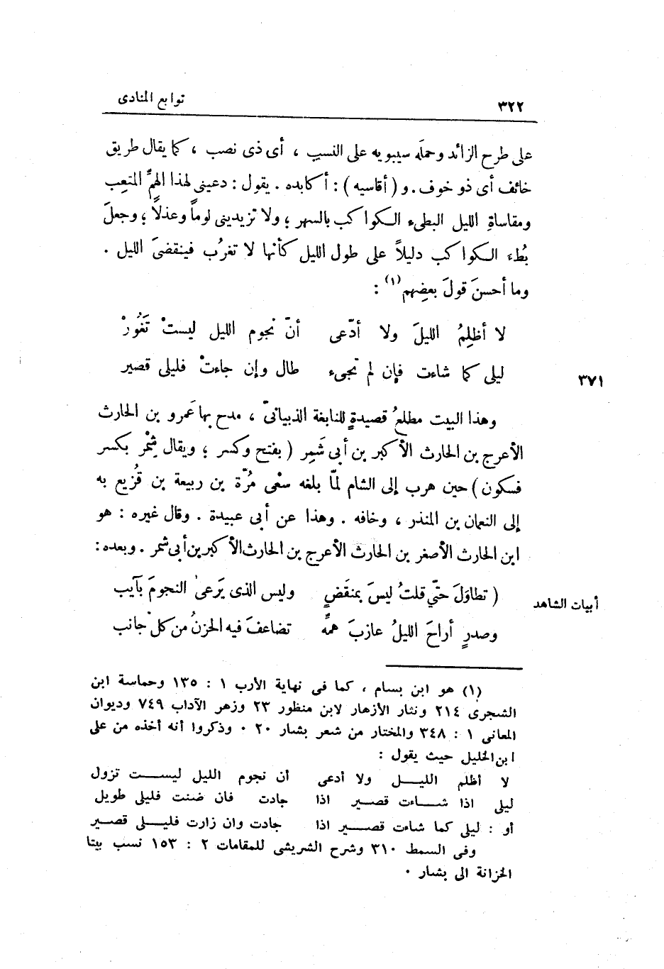 (تطاول حَتَّى قلت لَيْسَ بمنقضٍ ... وَلَيْسَ الَّذِي يرْعَى النُّجُوم بآيب)