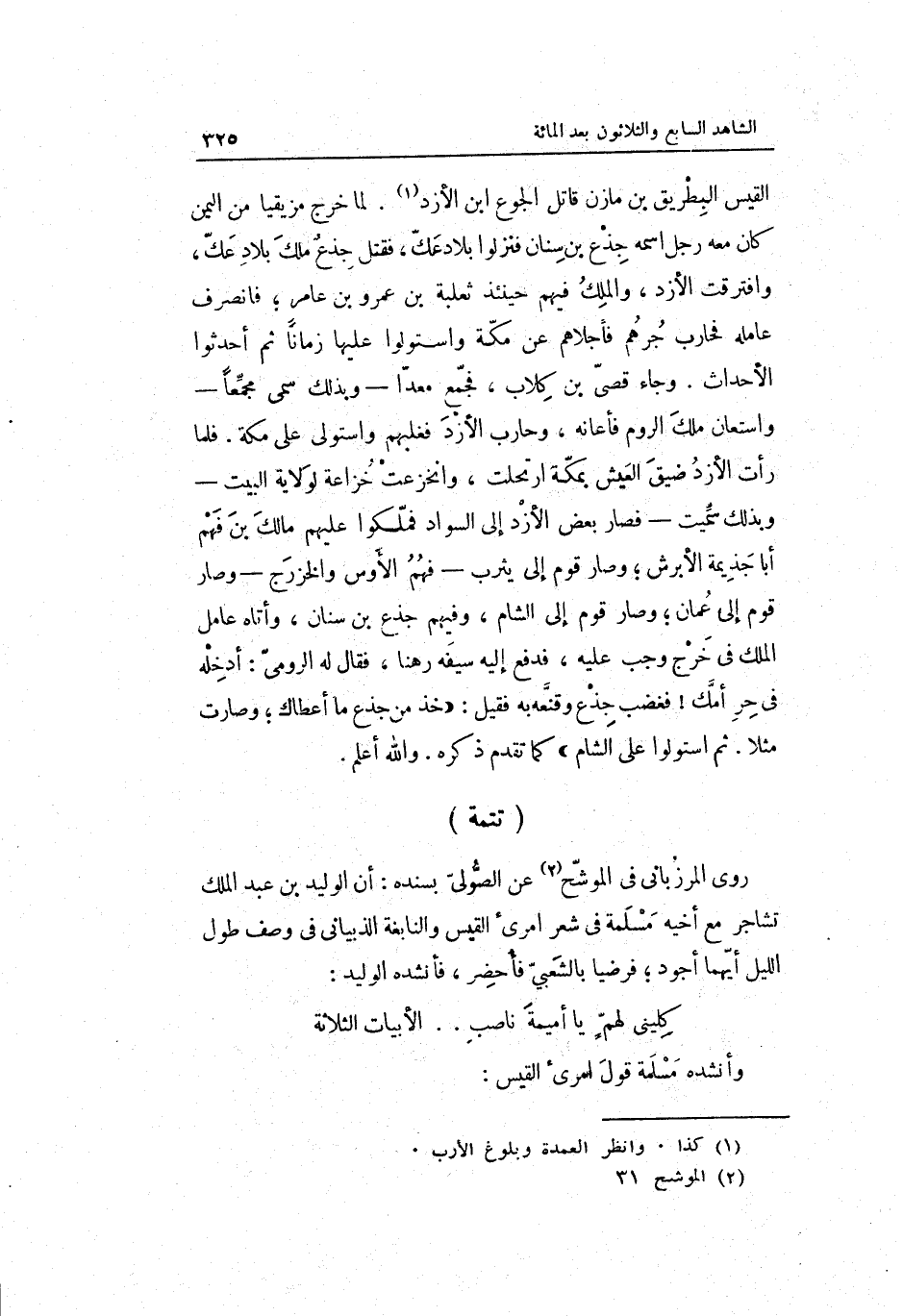تَتِمَّة روى المرزباني فِي الموشح عَن الصولي بِسَنَدِهِ: أَن الْوَلِيد بن عبد الْملك تشاجر مَعَ أَخِيه مسلة فِي شعر امْرِئ الْقَيْس والنابغة الذبياني فِي وصف طول اللَّيْل أَيهمَا أَجود فرضيا بالشعبي فأحضر فأنشده الْوَلِيد: كليني لَهُم يَا أُمَيْمَة ناصب. . الأبيات الثَّلَاثَة.)