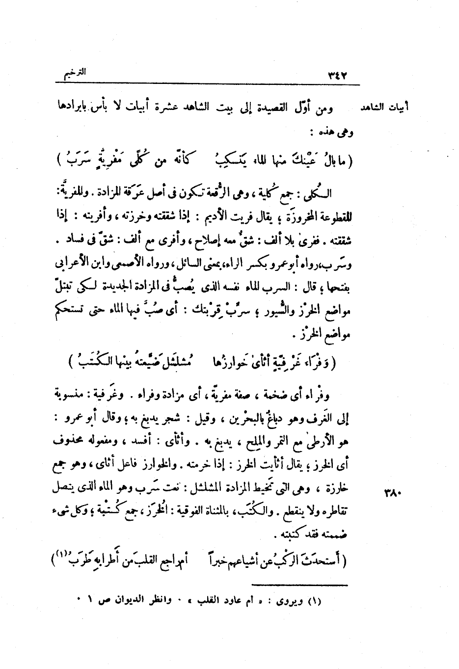 وفراء أَي: ضخمة صفة مفرية أَي: مزادة وفراء. وغرفية: منسوبة إِلَى الغرف وَهُوَ دباغ بِالْبَحْرَيْنِ وَقيل: شجر يدبغ بِهِ وَقَالَ أَبُو عَمْرو: هُوَ الأرطى مَعَ التَّمْر وَالْملح يدبغ بِهِ. وأثأى: أفسد ومفعوله مَحْذُوف أَي: الخرز يُقَال: أثأيت الخرز: إِذا خرمته. والخوارز فَاعل أثأى وَهُوَ جمع خارزة وَهِي الَّتِي تخيط المزادة. المشلشل: نعت سرب وَهُوَ المَاء الَّذِي يتَّصل تقاطره وَلَا يَنْقَطِع. والْكتب بِالْمُثَنَّاةِ الْفَوْقِيَّة: الْخَزّ جمع كتبة وكل شَيْء ضممته فقد كتبته.