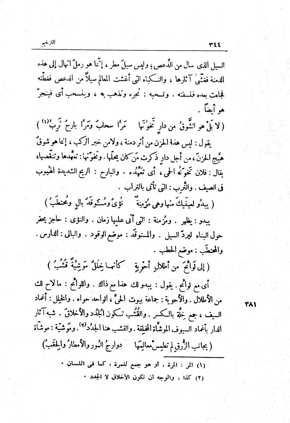 يَبْدُو: يظْهر. ومزمنة: الَّتِي أَتَى عَلَيْهَا زمَان. والنؤي حاجز يحْفر حول الْبناء ليرد السَّيْل. والمستوقد: مَوضِع الْوقُود. والْبَالِي: الدارس. والمحتطب: مَوضِع الْحَطب.