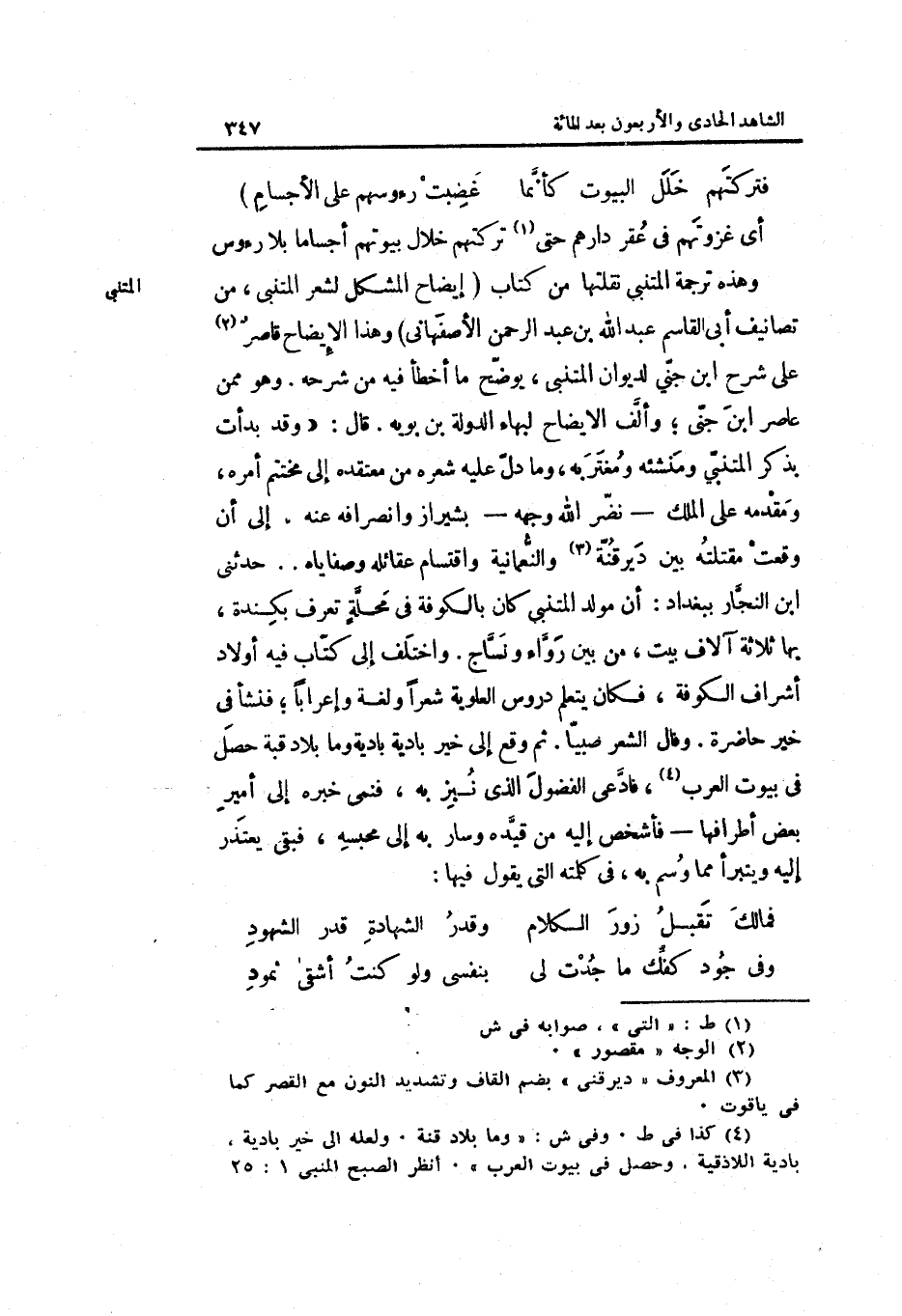 قَالَ: وَقد بدأت بِذكر المتنبي ومنشئه ومغتربه وَمَا دلّ عَلَيْهِ شعره من معتقده إِلَى مختتم أمره ومقدمه على الْملك نضر الله وَجهه بشيراز وانصرافه عَنهُ إِلَى أَن وَقعت مقتلته بَين دير قنة والنعمانية واقتسام عقائله وصفاياه. .