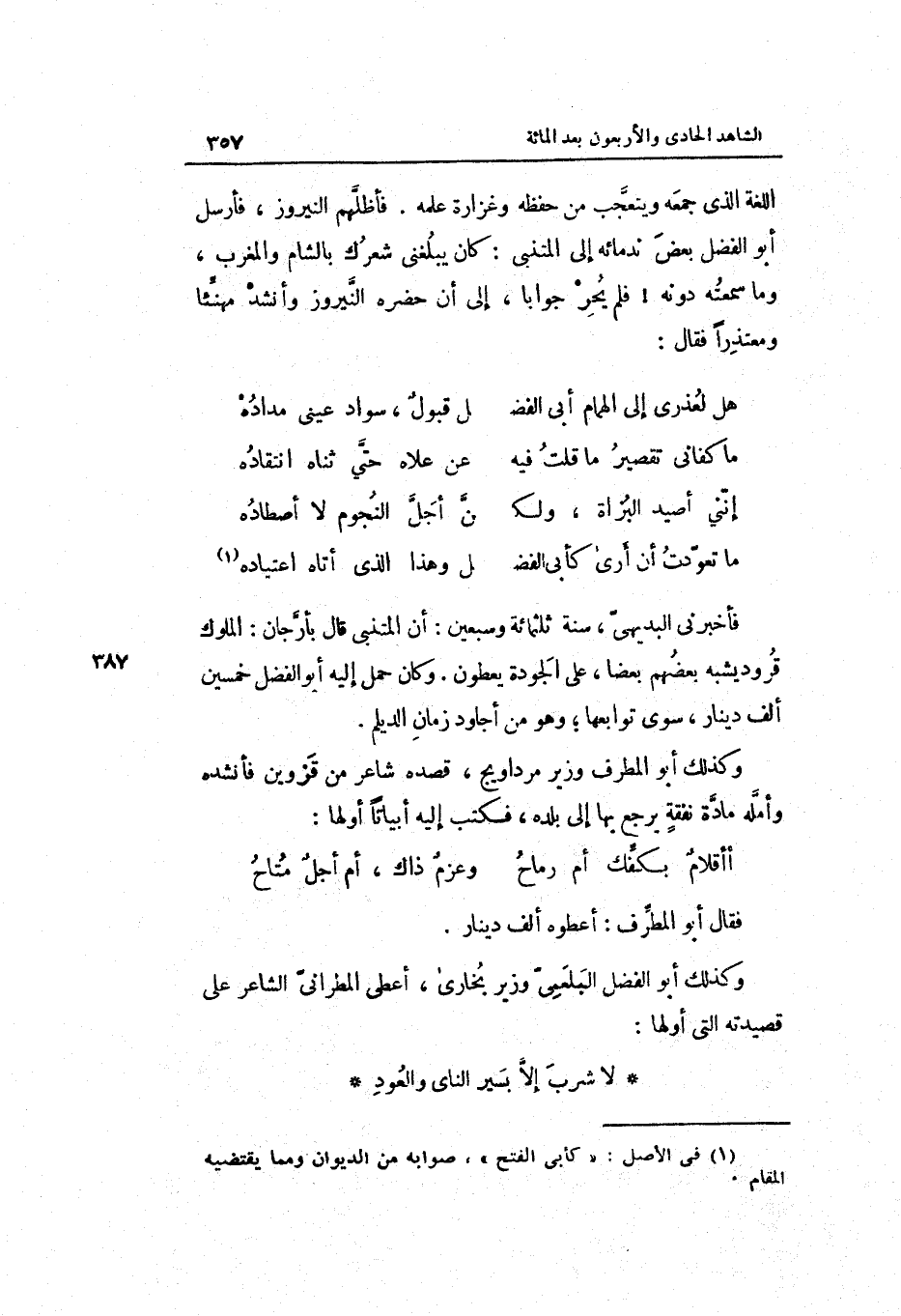 اللُّغَة الَّذِي جمعه ويتعجب من حفظه وغزارة علمه. فأظلهم النيروز فَأرْسل أَبُو الْفضل بعض ندمائه إِلَى المتنبي: كَانَ يبلغنِي شعرك بِالشَّام وَالْمغْرب وَمَا سمعته دونه فَلم يحر جَوَابا إِلَى أَن حَضَره النيروز وأنشده مهنئاً ومعتذراً فَقَالَ: