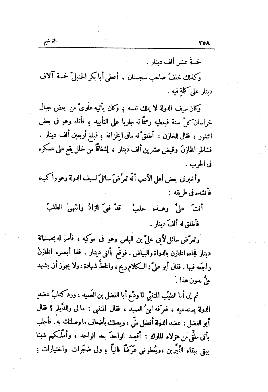 ثمَّ إِن أَبَا الطّيب المتنبي لما ودع أَبَا الْفضل بن العميد ورد كتاب عضد الدولة يستدعيه فَعرفهُ ابْن العميد فَقَالَ المتنبي: مَا لي وللديلم فَقَالَ أَبُو الْفضل: عضد الدولة أفضل مني ويصلك بأضعاف مَا وصلتك بِهِ. فَأجَاب بِأَنِّي ملقى من هَؤُلَاءِ الْمُلُوك: أقصد الْوَاحِد بعد الْوَاحِد وأملكهم شَيْئا يبْقى بِبَقَاء النيربين ويعطوني عرضا فانياً ولي ضجرات واختيارات