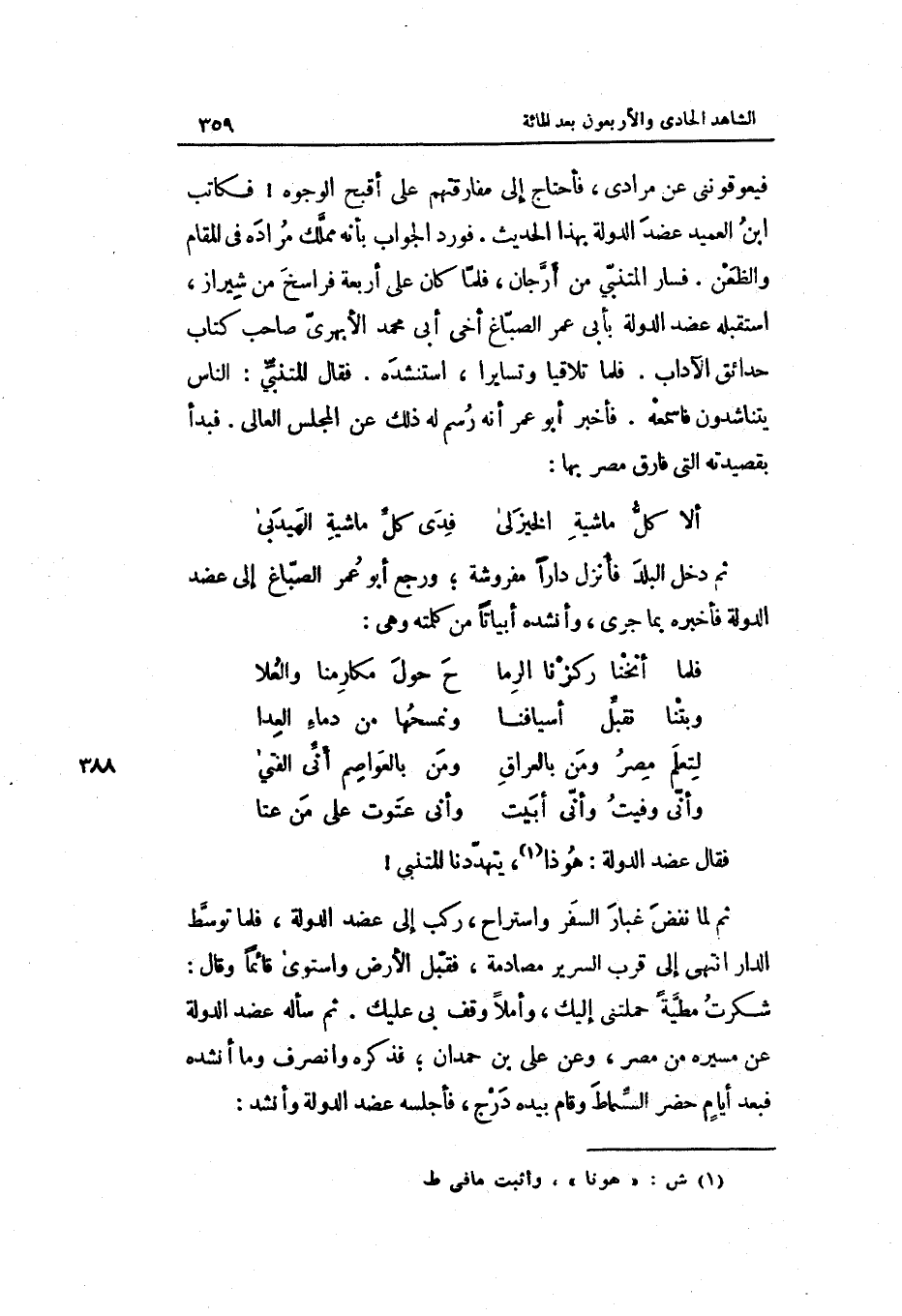 فورد الْجَواب بِأَنَّهُ مملك مُرَاده فِي الْمقَام والظعن. فَسَار المتنبي من أرجان فَلَمَّا كَانَ على أَرْبَعَة فراسخ من شيراز استقبله عضد الدولة بِأبي عمر الصّباغ أخي أبي مُحَمَّد الْأَبْهَرِيّ صَاحب كتاب حدائق الْآدَاب. فَلَمَّا تلاقيا وتسايرا استنشده. فَقَالَ: المتنبي: النَّاس يتناشدون فاسمعه.