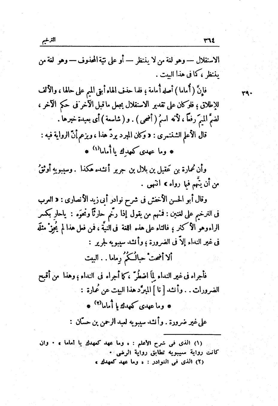 وَقَالَ أَبُو الْحسن الْأَخْفَش فِي شرح نَوَادِر أبي زيد الْأنْصَارِيّ: الْعَرَب فِي التَّرْخِيم على لغتين: فَمنهمْ من يَقُول إِذا رخم حارثاً وَنَحْوه: يَا حَار بِكَسْر الرَّاء وَهُوَ الْأَكْثَر فالثاء على هَذِه اللُّغَة فِي النِّيَّة فَمن فعل هَذَا لم يجز مثله فِي غير النداء إِلَّا فِي الضَّرُورَة وَأنْشد سِيبَوَيْهٍ لجرير: أَلا أضحت حبالكم رماما. . الْبَيْت فأجراه فِي غير النداء لما اضْطر كَمَا أجراه فِي النداء وَهَذَا من أقبح الضرورات. . وأنشدنا الْمبرد هَذَا الْبَيْت عَن عمَارَة: وَمَا عهدي كعهدك يَا أماما على غير ضَرُورَة. وَأنْشد سِيبَوَيْهٍ لعبد الرَّحْمَن بن حسان: