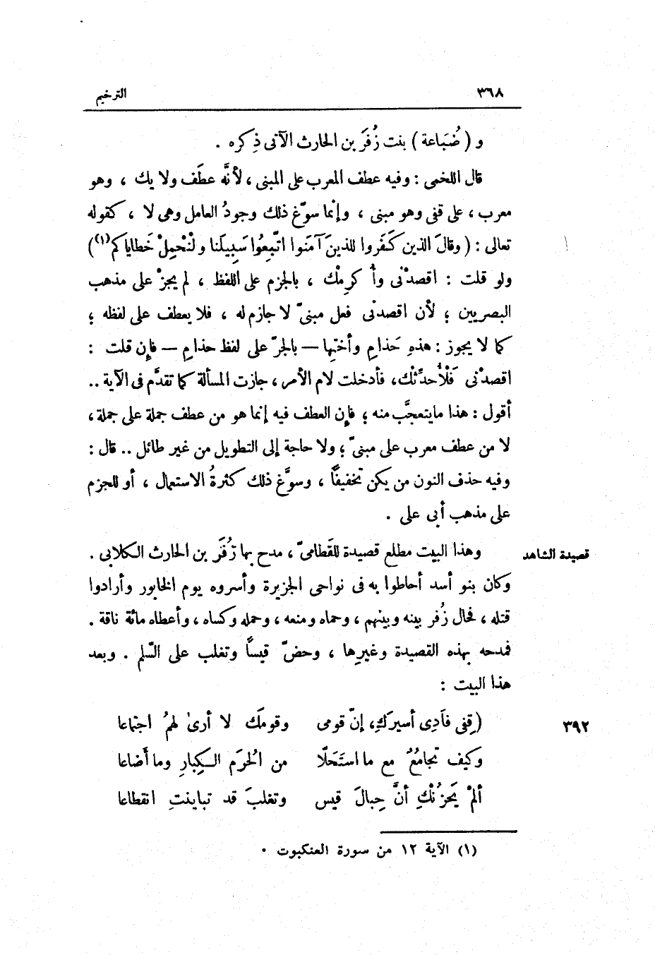 قَالَ اللَّخْمِيّ: وَفِيه عطف المعرب على الْمَبْنِيّ لِأَنَّهُ عطف وَلَا يَك وَهُوَ مُعرب على قفي وَهُوَ مَبْنِيّ وَإِنَّمَا سوغ ذَلِك وجود الْعَامِل وَهِي لَا كَقَوْلِه تَعَالَى: وَقَالَ الَّذين كفرُوا للَّذين آمنُوا اتبعُوا سبيلنا ولنحمل خطاياكم وَلَو قلت: اقصدني وأكرمك بِالْجَزْمِ على اللَّفْظ لم يجز على مَذْهَب الْبَصرِيين لِأَن اقصدني فعل مَبْنِيّ لَا جازم لَهُ فَلَا يعْطف على لَفظه كَمَا لَا يجوز: هَذِه حذام وَأُخْتهَا بِالْجَرِّ على لفظ حذام. فَإِن قلت: اقصدني فلأحدثك فأدخلت لَام الْأَمر جَازَت الْمَسْأَلَة كَمَا تقدم فِي الْآيَة. .)