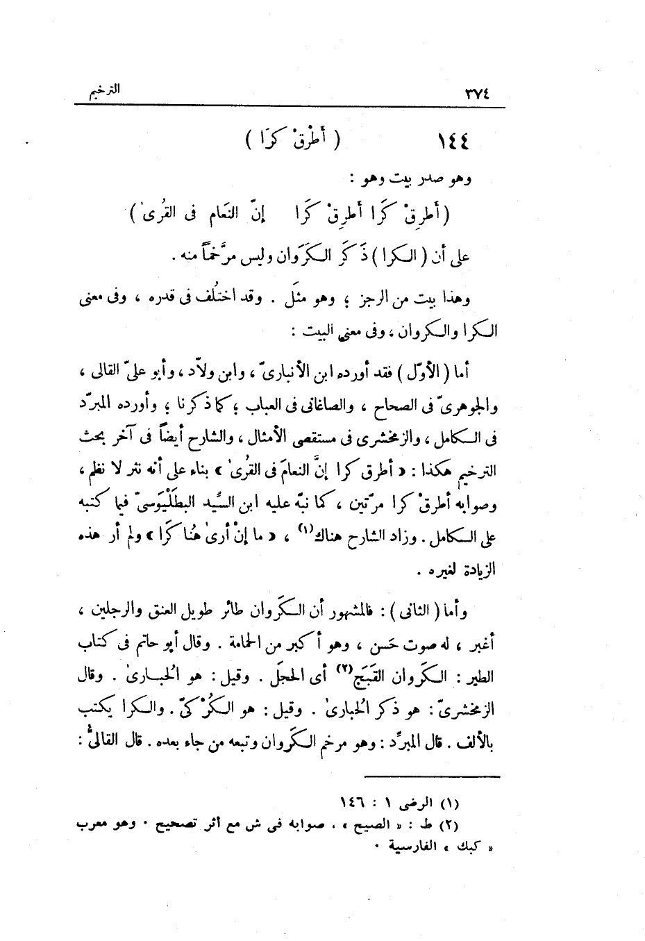 وَهَذَا بَيت من الرجز وَهُوَ مثل. وَقد اخْتلف فِي قدره وَفِي معنى الكرا والكروان وَفِي معنى الْبَيْت: أما الأول فقد أوردهُ ابْن الْأَنْبَارِي وَابْن ولاد وَأَبُو عَليّ القالي والجوهري فِي الصِّحَاح والصاغاني فِي الْعباب كَمَا ذكرنَا وَأوردهُ الْمبرد فِي الْكَامِل والزمخشري فِي مستقصى الْأَمْثَال وَالشَّارِح أَيْضا فِي آخر بحث التَّرْخِيم هَكَذَا: أطرق كرا إِن النعام فِي الْقرى بِنَاء على انه نثر لَا نظم وَصَوَابه أطرق كرا مرَّتَيْنِ كَمَا نبه عَلَيْهِ ابْن السَّيِّد البطليوسي فِيمَا كتبه على الْكَامِل. وَزَاد الشَّارِح هُنَاكَ مَا إِن أرى هُنَا كرا وَلم أر هَذِه الزِّيَادَة لغيره.