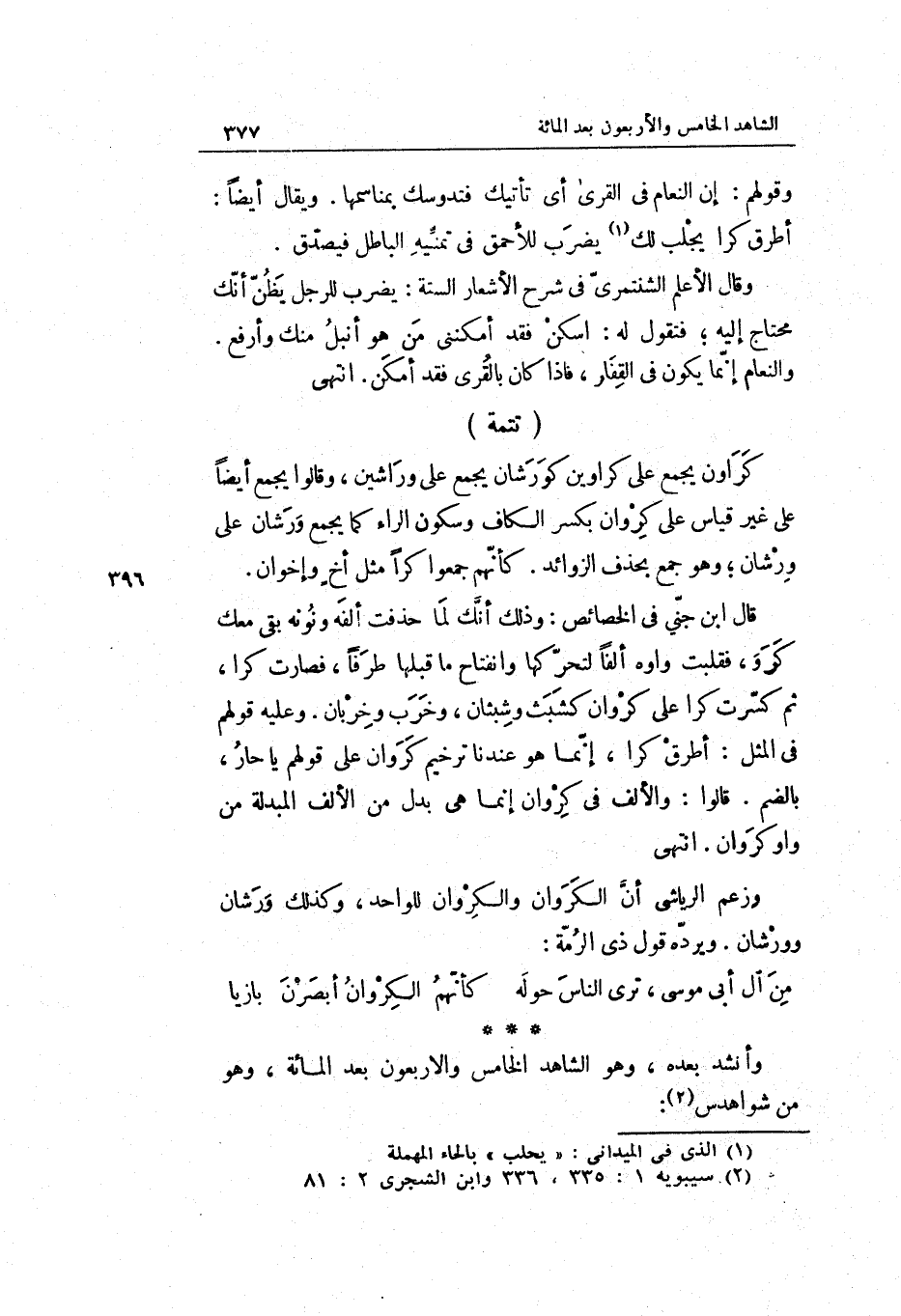 تَتِمَّة: كروان يجمع على كراوين كورشان يجمع على وراشين وَقَالُوا يجمع أَيْضا على غير قِيَاس على كروان بِكَسْر الْكَاف وَسُكُون الرَّاء كَمَا يجمع ورشان على ورشان وَهُوَ جمع بِحَذْف الزَّوَائِد.