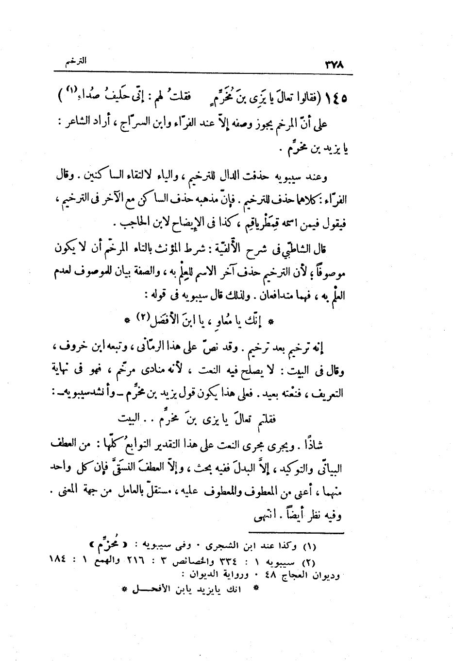 على أَن المرخم يجوز وَصفه إِلَّا عِنْد الْفراء وَابْن السراج أَرَادَ الشَّاعِر: يَا يزِيد ابْن مخرم.