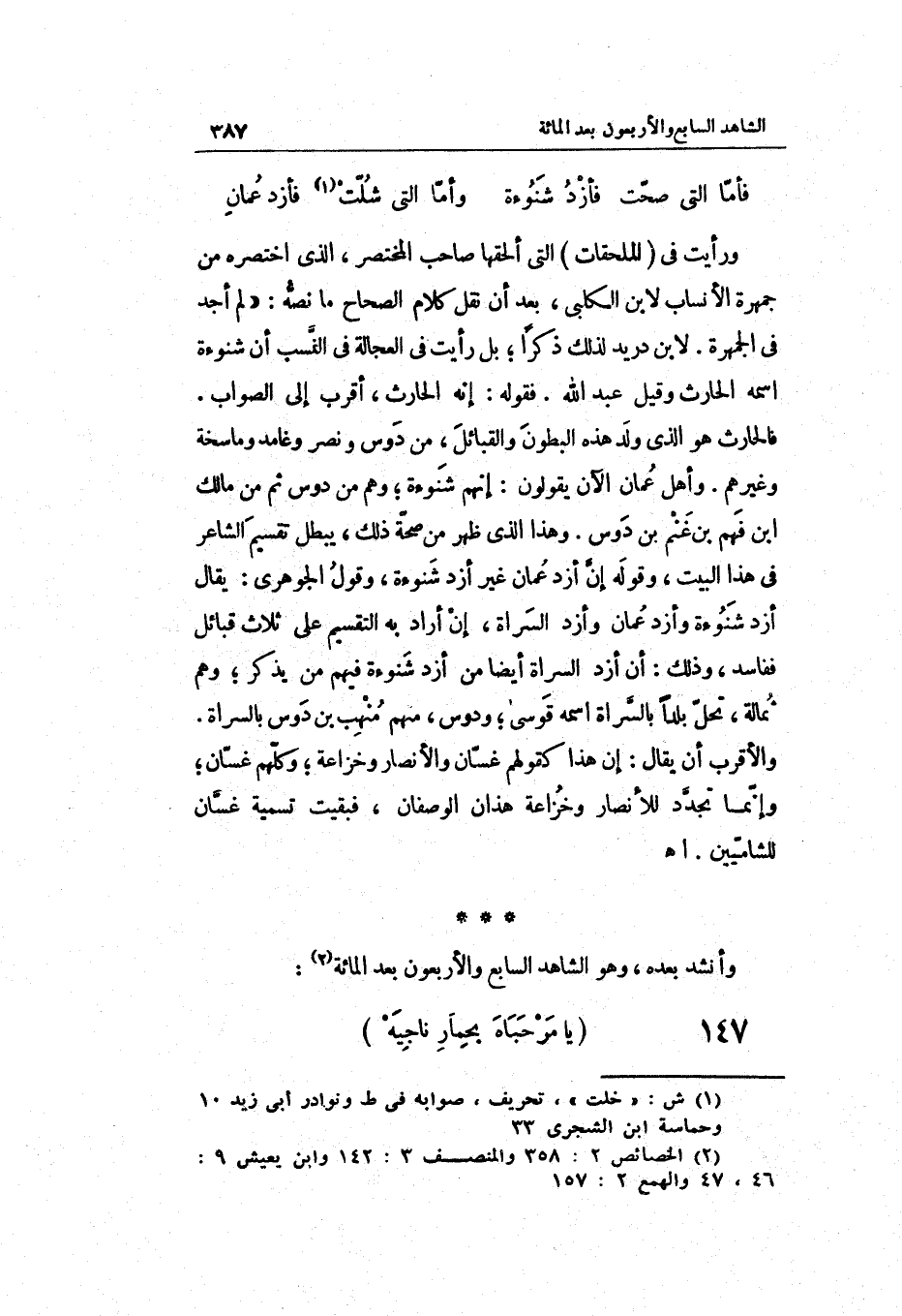 وَهَذَا الَّذِي ظهر من صِحَة ذَلِك يبطل تَقْسِيم الشَّاعِر فِي هَذَا الْبَيْت وَقَوله: إِن أَزْد عمان غير أَزْد شنُوءَة وَقَول الْجَوْهَرِي: يُقَال أَزْد شنُوءَة وأزد عمان وأزد السراة إِن أَرَادَ بهم التَّقْسِيم على ثَلَاث قبائل ففاسد وَذَلِكَ: أَن أَزْد السراة أَيْضا من أَزْد شنُوءَة فيهم من يذكر وهم ثمالة تحل بَلَدا بالسراة اسْمه قوسى ودوس مِنْهُم منْهب بن دوس بالسراة. وَالْأَقْرَب أَن يُقَال: إِن هَذَا كَقَوْلِهِم غَسَّان وَالْأَنْصَار وخزاعة وَكلهمْ غَسَّان وَإِنَّمَا تجدّد للْأَنْصَار وخزاعة هَذَانِ الوصفان فَبَقيت تَسْمِيَة غَسَّان للشاميين ا. هـ.