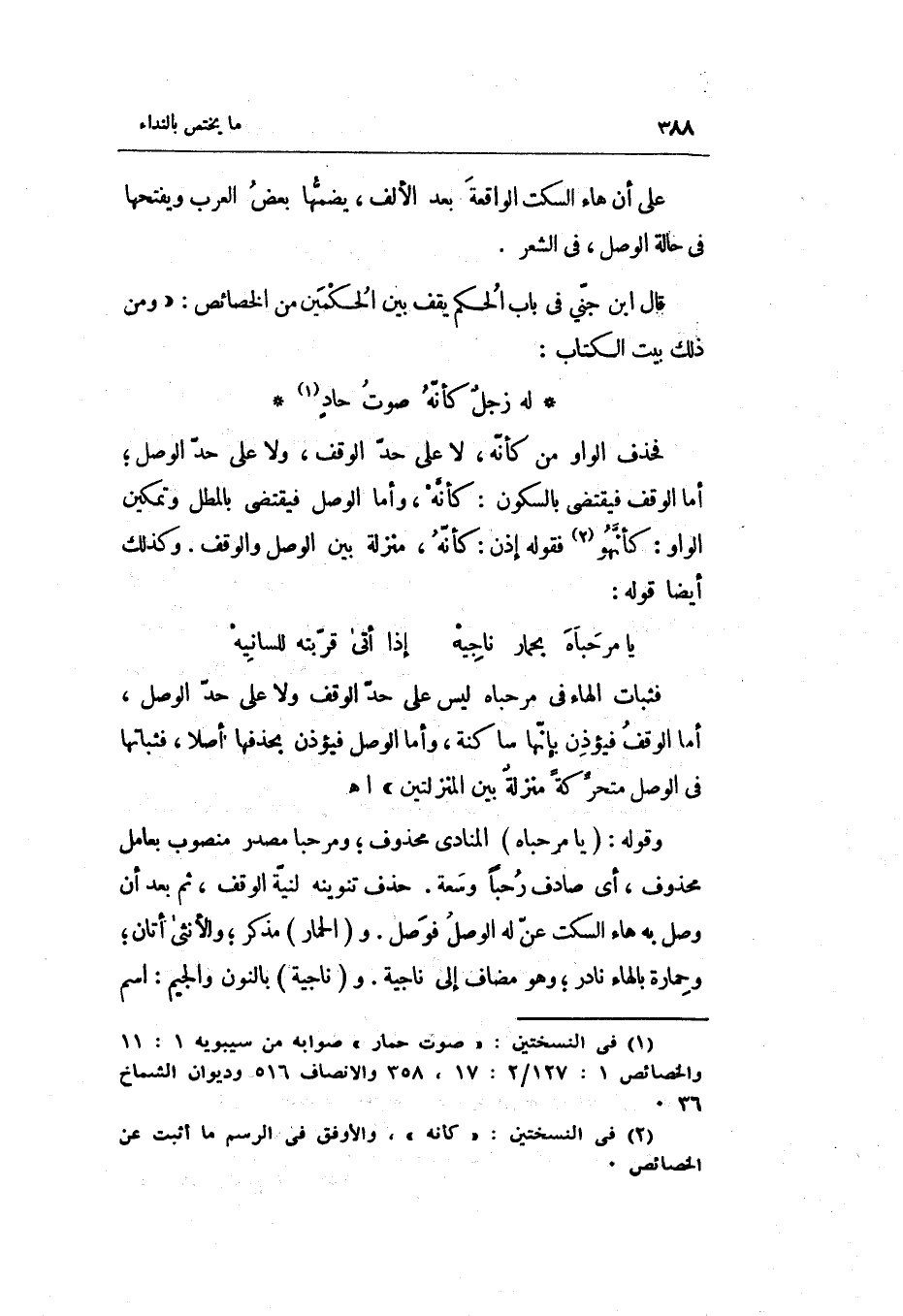 قَالَ ابْن جني فِي بَاب الحكم يقف بَين الْحكمَيْنِ من الخصائص: وَمن ذَلِك بَيت الْكتاب: لَهُ زجلٌ كَأَنَّهُ صَوت حادٍ فَحذف الْوَاو من كَأَنَّهُ لَا على حد الْوَقْف وَلَا على حد الْوَصْل أما الْوَقْف فَيَقْتَضِي بِالسُّكُونِ: كَأَنَّهُ وَأما الْوَصْل فَيَقْتَضِي بالمطل وتمكين الْوَاو: كأنهو فَقَوله إِذن: كَأَنَّهُ منزلَة بَين الْوَصْل وَالْوَقْف.