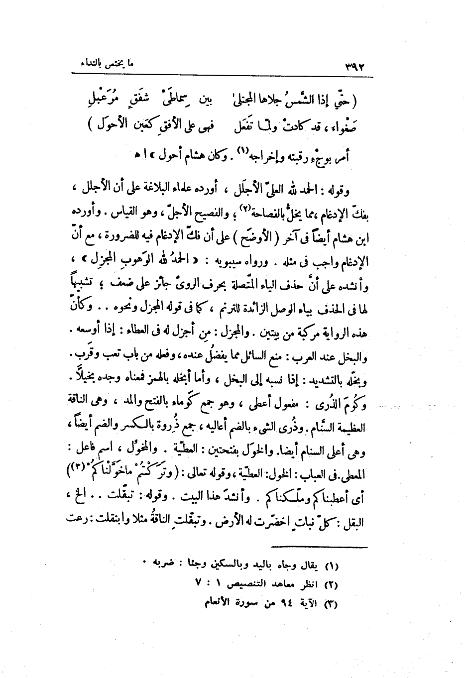 وَأوردهُ ابْن هِشَام أَيْضا فِي آخر الأوضح على أَن فك الْإِدْغَام فِيهِ للضَّرُورَة مَعَ أَن الْإِدْغَام وَاجِب فِي مثله. وَرَوَاهُ سِيبَوَيْهٍ: الْحَمد لله الوهوب المجزل وأنشده على أَن حذف الْيَاء الْمُتَّصِلَة بِحرف الروي جَائِز على ضعف تَشْبِيها لَهَا فِي الْحَذف بياء الْوَصْل الزَّائِدَة للترنم كَمَا فِي قَوْله المجزل وَنَحْوه. . وَكَأن هَذِه الرِّوَايَة مركبة من بَيْتَيْنِ. والمجزل: من أجزل لَهُ فِي الْعَطاء: إِذا أوسعه. وَالْبخل عِنْد الْعَرَب: منع السَّائِل مِمَّا يفضل عِنْده وَفعله من بَاب تَعب وَقرب. وبخله بِالتَّشْدِيدِ: إِذا نسبه إِلَى الْبُخْل وَأما أبخله بِالْهَمْز فَمَعْنَاه وجده بَخِيلًا. وكوم الذرى: مفعول أعْطى وَهُوَ جمع كوماء بِالْفَتْح وَالْمدّ وَهِي النَّاقة الْعَظِيمَة السنام. وذرى الشَّيْء بِالضَّمِّ أعاليه جمع ذرْوَة بِالْكَسْرِ وَالضَّم أَيْضا وَهِي أَعلَى السنام أَيْضا. والخول بِفتْحَتَيْنِ: الْعَطِيَّة. والمخول)