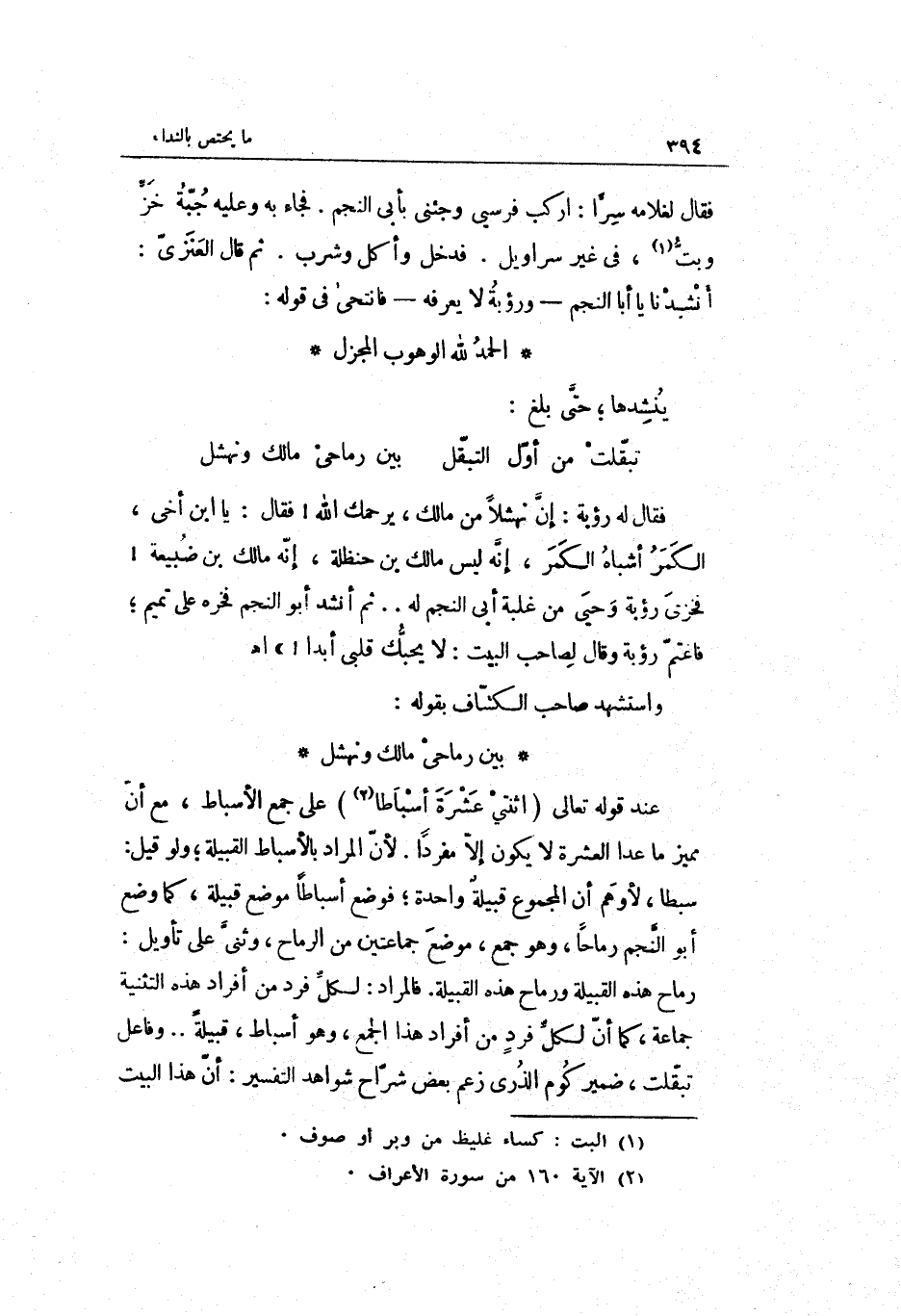 فَقَالَ لَهُ رؤبة: إِن نَهْشَلَا من مَالك يَرْحَمك الله فَقَالَ: يَا ابْن أخي الكمر أشباه الكمر إِنَّه لَيْسَ مَالك بن حَنْظَلَة إِنَّه مَالك بن ضبيعة فخزي رؤبة وحيي من غَلَبَة أبي النَّجْم لَهُ. . ثمَّ وَاسْتشْهدَ صَاحب الْكَشَّاف بقوله:)