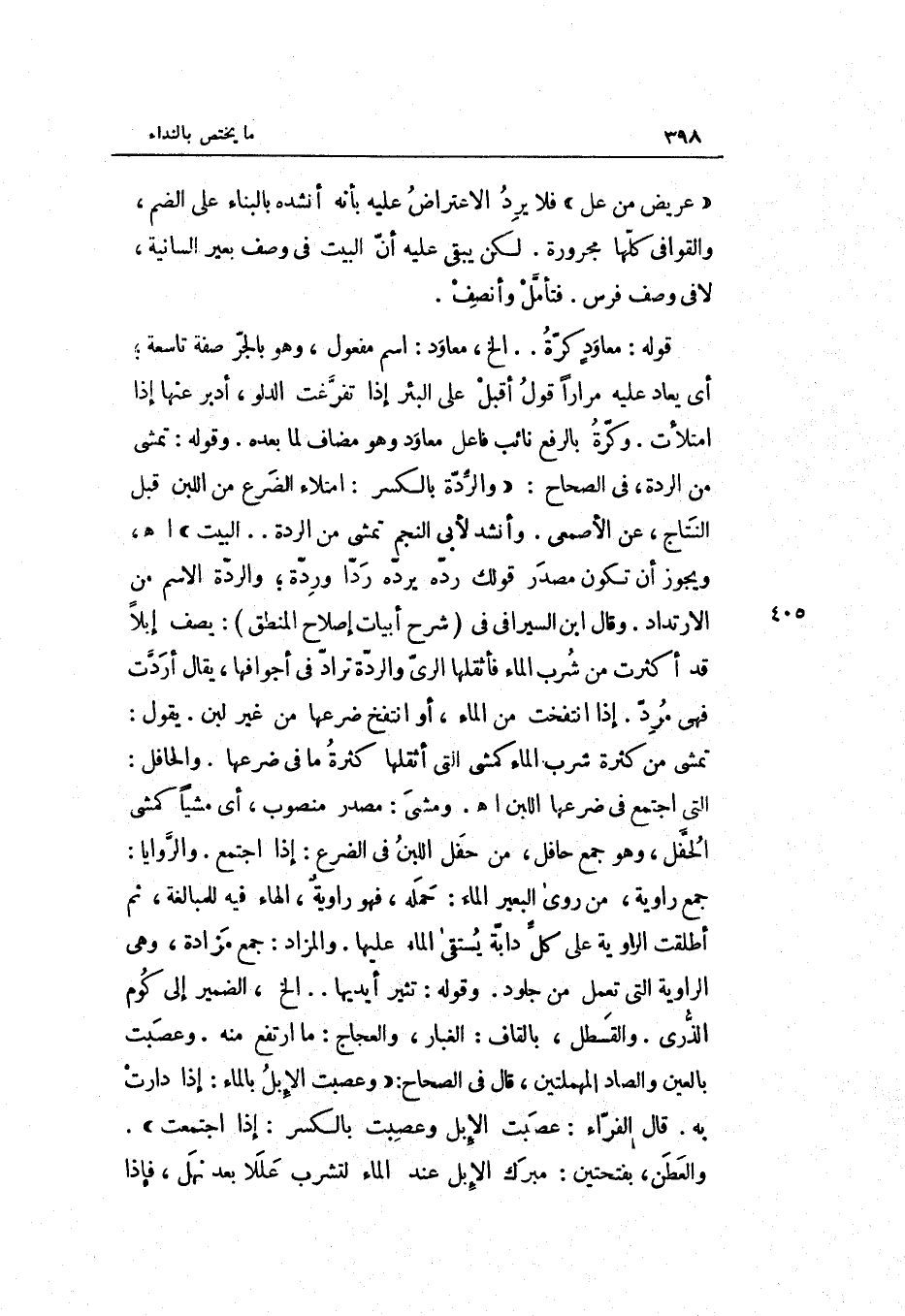 وَقَالَ ابْن السيرافي فِي شرح أَبْيَات إصْلَاح الْمنطق: يصف إبِلا قد أكثرت من شرب المَاء فأثقلها الرّيّ وَالرِّدَّة ترَاد فِي أجوافها يُقَال: أردْت فَهِيَ مرد. إِذا انتفخت من المَاء أَو انتفخ ضرْعهَا من غير لبن. يَقُول: تمشي من كَثْرَة شرب المَاء كمشي الَّتِي أثقلها كَثْرَة مَا فِي ضرْعهَا. والحافل: الَّتِي اجْتمع فِي ضرْعهَا اللَّبن ا. هـ. ومشي: مصدر مَنْصُوب أَي: مشياً كمشي الحفل وَهُوَ جمع حافل من حفل اللَّبن فِي الضَّرع: إِذا اجْتمع. والروايا: جمع رِوَايَة من روى الْبَعِير المَاء: حمله فَهُوَ راويةٌ الْهَاء فِيهِ للْمُبَالَغَة ثمَّ أطلقت الرِّوَايَة على كل دَابَّة يستقى المَاء عَلَيْهَا. والمزاد: جمع مزادة وَهِي الراوية الَّتِي تعْمل من جُلُود.