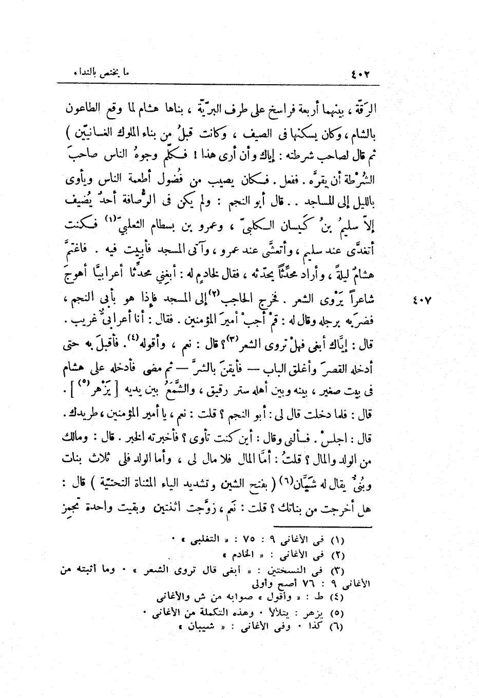 فَأقبل بِهِ حَتَّى أدخلهُ الْقصر وأغلق الْبَاب فأيقن بِالشَّرِّ ثمَّ مضى فَأدْخلهُ على هِشَام فِي بَيت صَغِير بَينه وَبَين أَهله ستر رَقِيق والشمع بَين يَدَيْهِ يزهر. قَالَ: فَلَمَّا دخلت قَالَ لي: أَبُو النَّجْم قلت: نعم يَا أَمِير الْمُؤمنِينَ طريدك. قَالَ: اجْلِسْ. فَسَأَلَنِي وَقَالَ: أَيْن كنت تأوي فَأَخْبَرته الْخَبَر. قَالَ: وَمَالك من الْوَلَد وَالْمَال قلت: أما المَال فَلَا مَال لي وَأما الْوَلَد فلي ثَلَاث بَنَات وَبني يُقَال لَهُ: شيان بِفَتْح الشين وَتَشْديد الْيَاء الْمُثَنَّاة التَّحْتِيَّة قَالَ: هَل أخرجت من بناتك قلت: نعم زوجت اثْنَتَيْنِ وَبقيت وَاحِدَة تجمز