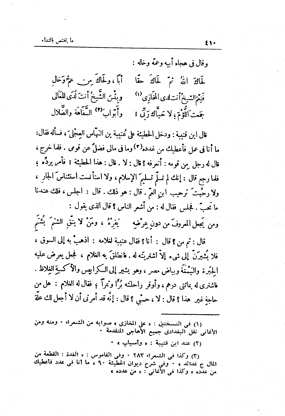 قَالَ ابْن قُتَيْبَة: وَدخل الحطيئة على عتيبة بن النهاس الْعجلِيّ فَسَأَلَهُ فَقَالَ: مَا أَنا فِي عمل فأعطيك من غدده وَمَا فِي مَالِي فضلٌ عَن قومِي. فَلَمَّا خرج قَالَ لَهُ رجل من قومه: أتعرفه قَالَ: لَا قَالَ: هَذَا الحطيئة فَأمر برده فَلَمَّا رَجَعَ قَالَ: إِنَّك لم تسلم تَسْلِيم الْإِسْلَام وَلَا استأنست استئناس الْجَار وَلَا رَحبَتْ ترحيب ابْن الْعم. قَالَ: هُوَ ذَلِك. قَالَ: اجْلِسْ فلك