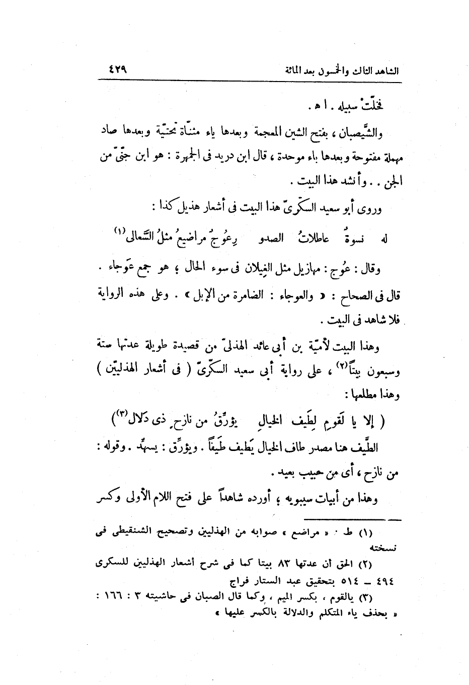 وَقَالَ: عوج: مهازيل مثل الغيلان فِي سوء الْحَال هُوَ جمع عوجاء. قَالَ فِي الصِّحَاح: وَهَذَا الْبَيْت لأمية بن أبي عَائِد الْهُذلِيّ من قصيدة طَوِيلَة عدتهَا سِتَّة وَسَبْعُونَ بَيْتا على رِوَايَة أبي سعيد السكرِي فِي أشعار الهذليين وَهَذَا مطْلعهَا: إِلَّا يَا لقومٍ لطيف الخيال يؤرق من نازحٍ ذِي دلال الطيف هُنَا مصدر طَاف الخيال يطِيف طيفاً. ويؤرق: يسهد. وَقَوله: من نازح أَي: من حبيب بعيد.
