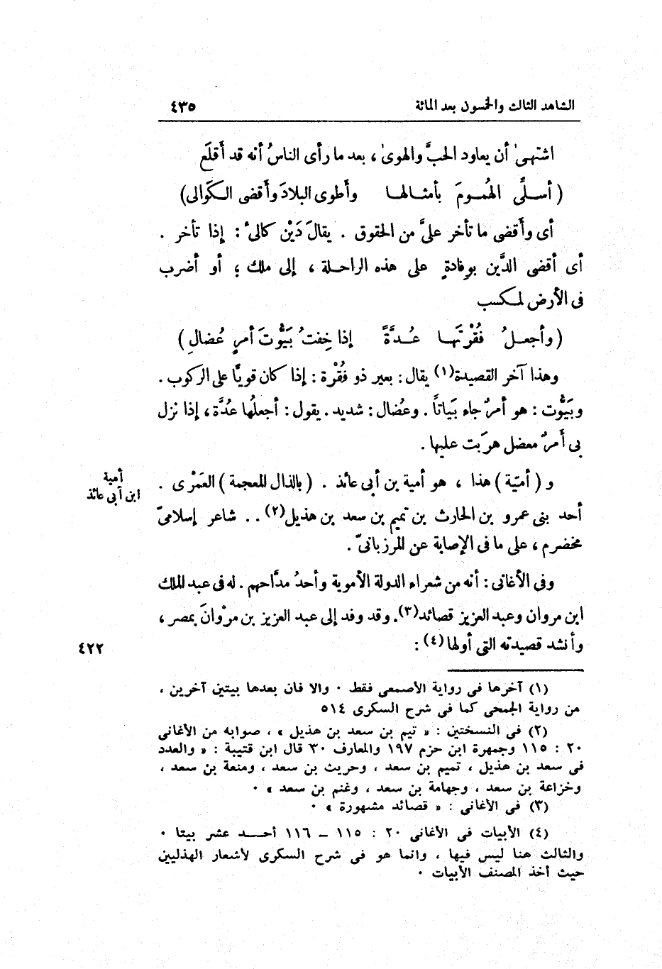 وَهَذَا آخر القصيدة يُقَال: بعير ذُو فقرة: إِذا كَانَ قَوِيا على الرّكُوب. وبيُوت: هُوَ أَمر جَاءَ بياتاً. وعضال: شَدِيد. يَقُول: أجعلها عدَّة إِذا نزل بِي أَمر معضل هربت عَلَيْهَا. وأُميَّة هَذَا هُوَ أُميَّة بن أبي عَائِذ. بِالذَّالِ الْمُعْجَمَة الْعمريّ. أحد بني عَمْرو بن الْحَارِث بن)