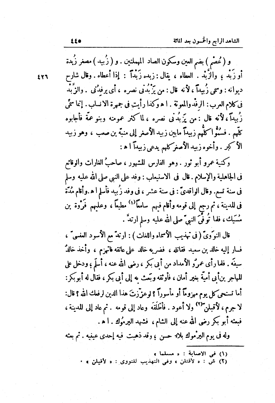 وعصم بِضَم الْعين وَسُكُون الصَّاد الْمُهْمَلَتَيْنِ. وزبيد مصغر زبدة أَو زبد والزبد: الْعَطاء يُقَال: زبده زبداً: إِذا أعطَاهُ. وَقَالَ شَارِح ديوانه: وَسمي زبيداً لِأَنَّهُ قَالَ: من يزبدني نَصره وَكَذَا رَأَيْت فِي جمهرة الْأَنْسَاب. إِنَّمَا سمي زبيداً لِأَنَّهُ قَالَ: من يزبدني نَصره لما كثر عمومته وَبَنُو عَمه فَأَجَابُوهُ كلهم. فسموا كلهم زبيداً مَا بَين زبيد الْأَصْغَر إِلَى مُنَبّه بن صَعب وَهُوَ زبيد الْأَكْبَر. وَأَخُوهُ زبيد الْأَصْغَر كلهم يدعى زبيداً ا. هـ.