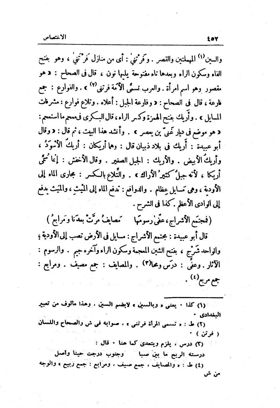وَالسِّين الْمُهْمَلَتَيْنِ وَالْقصر. وفرتنى: أَي: من منَازِل فرتنى وَهُوَ بِفَتْح الْفَاء وَسُكُون الرَّاء وَبعدهَا تَاء مَفْتُوحَة يَليهَا نون قَالَ فِي الصِّحَاح: هُوَ مَقْصُور وَهُوَ اسْم امْرَأَة. وَالْعرب تسمي الْأمة فرتنى. والفوارع: جمع فارعة قَالَ فِي الصِّحَاح: وفارعة الْجَبَل: أَعْلَاهُ. وتلاع فوارع: مشرفات المسايل. وأريك بِفَتْح الْهمزَة وَكسر الرَّاء قَالَ الْبكْرِيّ فِي مُعْجم مَا استعجم: هُوَ مَوضِع فِي ديار غَنِي بن يعصر.