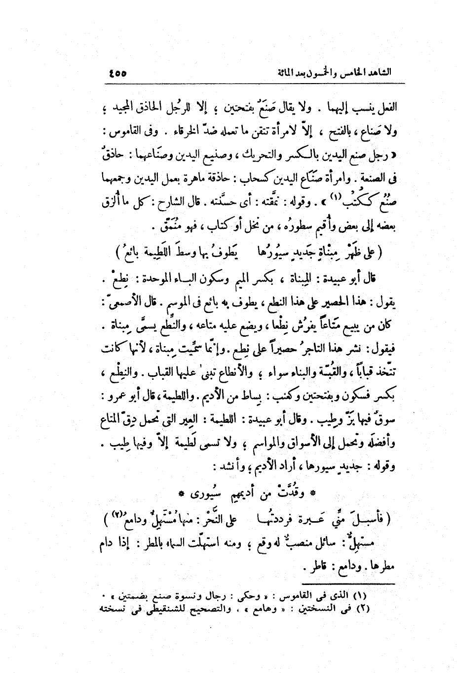 قَالَ أَبُو عُبَيْدَة: المبناة بِكَسْر الْمِيم وَسُكُون الْبَاء الْمُوَحدَة: نطع يَقُول: هَذَا الْحَصِير على هَذَا النطع يطوف بِهِ بَائِع فِي الْمَوْسِم. قَالَ الْأَصْمَعِي: كَانَ من يَبِيع مَتَاعا يفرش نطعاً وَيَضَع عَلَيْهِ مَتَاعه والنطع يُسمى مبناة. فَيَقُول: نشر هَذَا التَّاجِر حَصِيرا على نطع. وَإِنَّمَا سميت مبناة لِأَنَّهَا كَانَت تتَّخذ قباباً والقبة وَالْبناء سَوَاء والأنطاع تبنى عَلَيْهَا القباب. والنطع بِكَسْر فَسُكُون وبفتحتين وكعنب: بِسَاط من الْأَدِيم. واللطيمة قَالَ أَبُو عَمْرو: سوقٌ فِيهَا بز وَطيب. وَقَالَ أَبُو عُبَيْدَة: اللطيمة: العير الَّتِي تحمل دق الْمَتَاع وأفضله وَتحمل إِلَى الْأَسْوَاق والمواسم وَلَا تسمى لطيمة إِلَّا وفيهَا طيب. وَقَوله: جَدِيد سيورها أَرَادَ الْأَدِيم وَأنْشد: وقدت من أديمهم سيوري