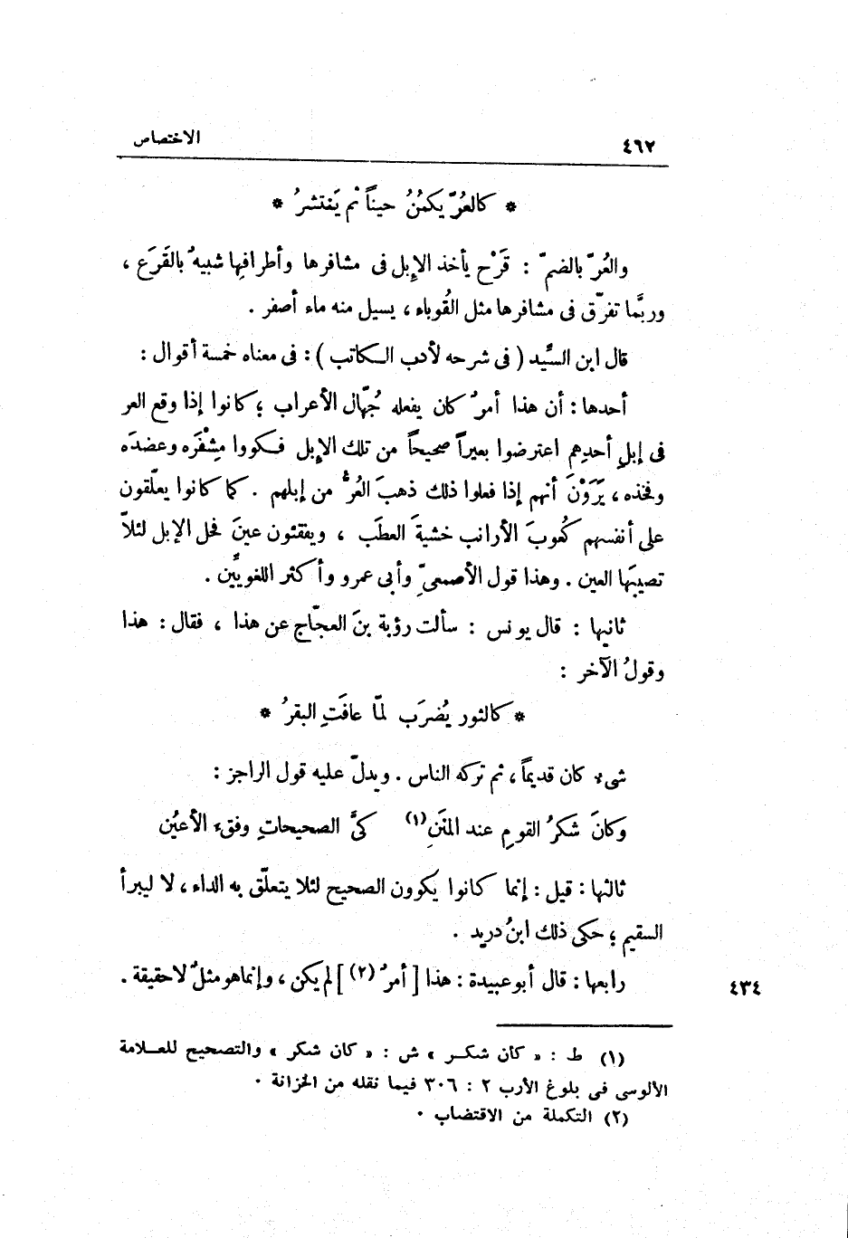 أَحدهمَا: أَن هَذَا أمرٌ كَانَ يَفْعَله جهال الْأَعْرَاب كَانُوا إِذا وَقع العر فِي إبل أحدهم اعْترضُوا بَعِيرًا صَحِيحا من تِلْكَ الْإِبِل فكووا مشفره وعضده وَفَخذه يرَوْنَ أَنهم إِذا فعلوا ذهب العر من إبلهم. كَمَا كَانُوا يعلقون على أنفسهم كعوب الأرانب خشيَة العطب ويفقؤون عين فَحل الْإِبِل لِئَلَّا تصيبها الْعين. وَهَذَا قَول الْأَصْمَعِي وَأبي عَمْرو وَأكْثر اللغويين.