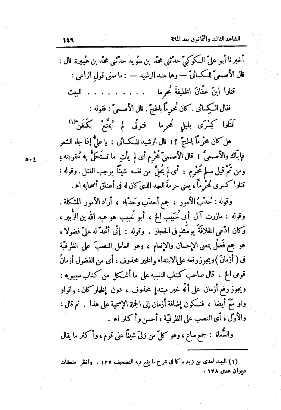 أخبرنَا أَبُو عَليّ الكوكبيّ حَدثنِي مُحَمَّد بن سُوَيْد حَدثنِي مُحَمَّد بن هُبَيْرَة قَالَ: قَالَ الْأَصْمَعِي للكسائي وهما عِنْد الرشيد: مَا معنى قَول الرَّاعِي: قتلوا ابْن عَفَّان الْخَلِيفَة محرما فَقَالَ الْكسَائي. كَانَ محرما بِالْحَجِّ. قَالَ الْأَصْمَعِي: فَقَوله: قتلوا كسْرَى بلَيْل محرما فَتَوَلّى لم يمتع بكفن هَل كَانَ محرما بِالْحَجِّ قَالَ الرشيد للكسائي: يَا عليّ إِذا جَاءَ الشّعْر فإياك والأصمعي قَالَ الْأَصْمَعِي محرم أَي: لم يَأْتِ مَا تستحل بِهِ عُقُوبَته وَمن ثمّ قيل مُسلم محرم أَي: لم يحلّ من نَفسه شَيْئا يُوجب الْقَتْل. وَقَوله: قتلوا كسْرَى محرما يَعْنِي حُرْمَة الْعَهْد الَّذِي كَانَ لَهُ فِي أَعْنَاق أَصْحَابه اه.