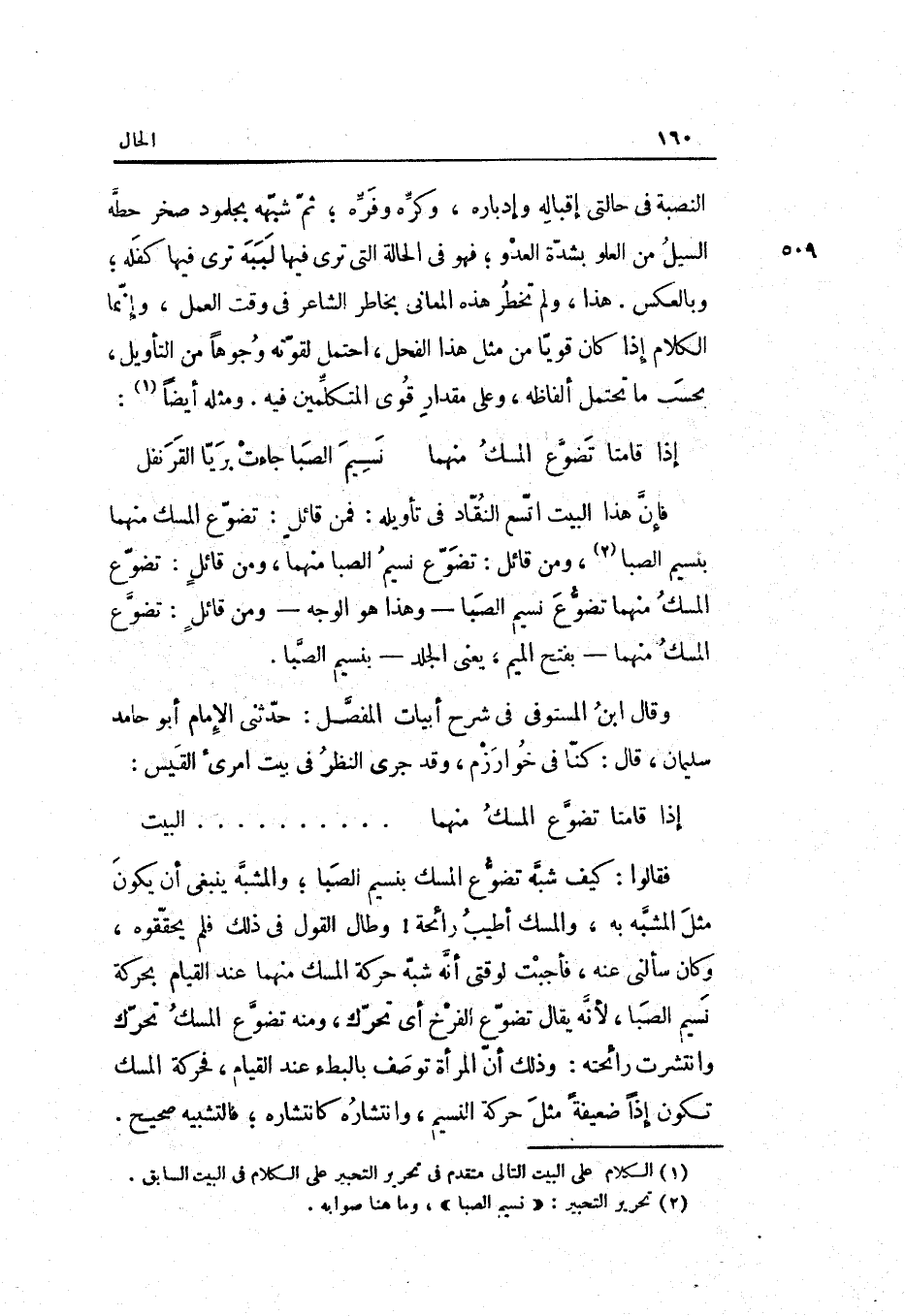 فَإِن هَذَا الْبَيْت اتَّسع النقاد فِي تَأْوِيله: فَمن قَائِل: تضوع مثل الْمسك مِنْهُمَا بنسيم الصِّبَا وَمن قَائِل: تضوع نسيم الصِّبَا مِنْهُمَا وَمن قَائِل: تشوع الْمسك مِنْهُمَا تضوع نسيم الصِّبَا وَهَذَا هُوَ الْوَجْه عِنْدِي وَمن قَائِل: تضوع الْمسك مِنْهُمَا بِفَتْح الْمِيم يَعْنِي الْجلد بنسيم الصِّبَا.