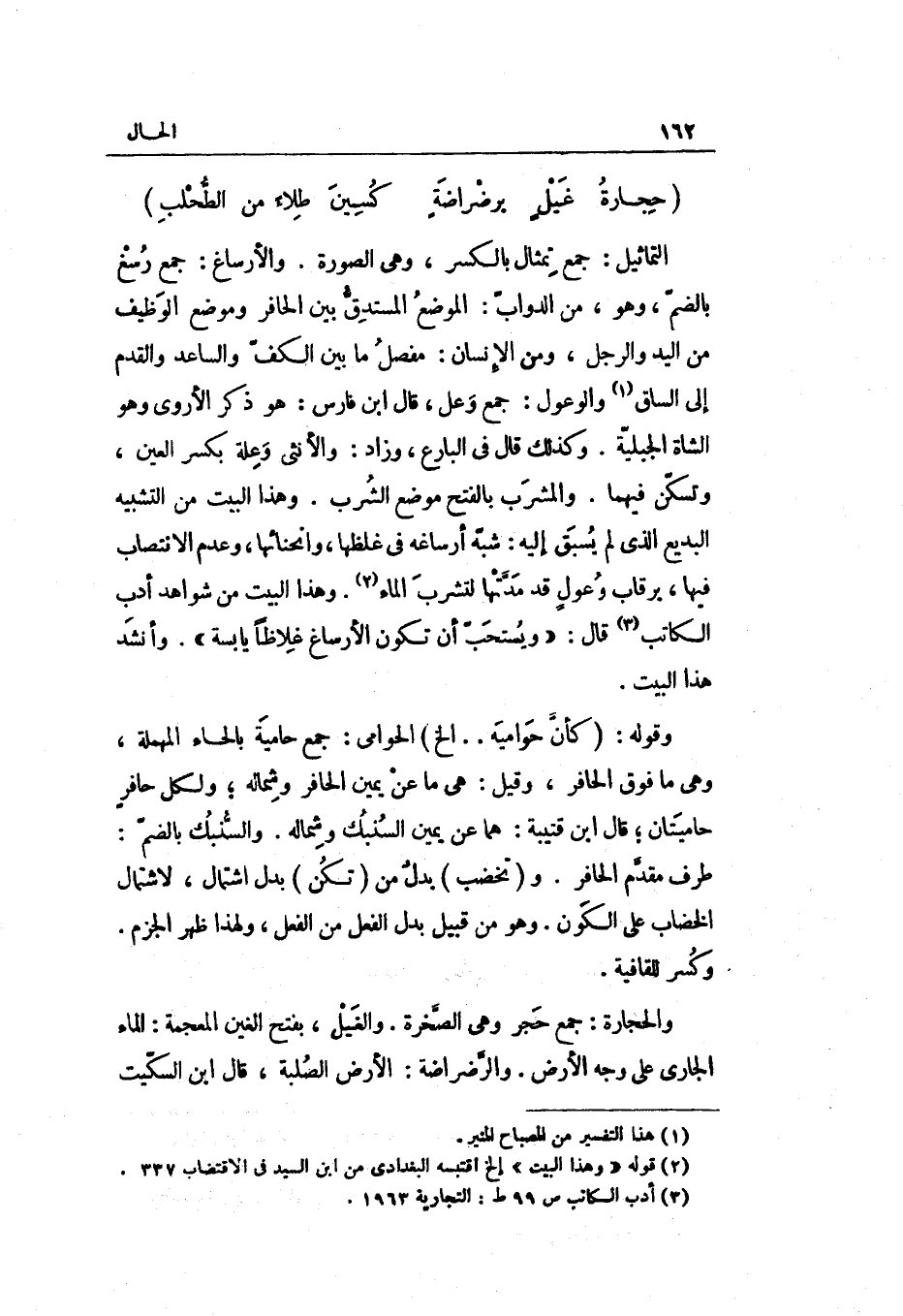 وَالْحِجَارَة: جمع حجر وَهِي الصخر. والغيل بِفَتْح الْغَيْن الْمُعْجَمَة: المَاء الْجَارِي على وَجه الأَرْض. والرضراضة: الأَرْض الصلبة قَالَ ابْن السّكيت