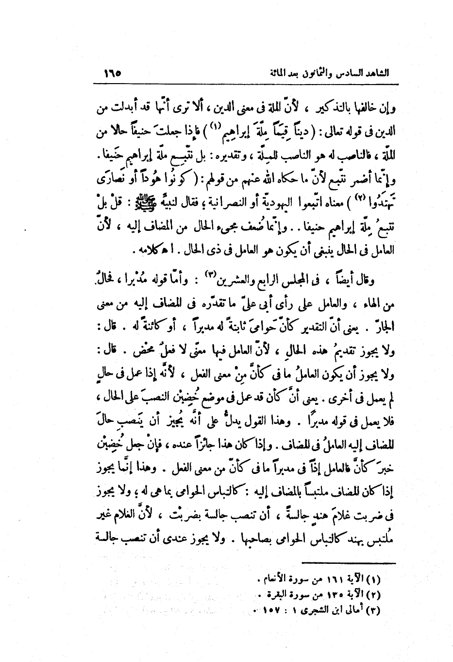 وَإِن خالفها بالتذكير لِأَن الْملَّة فِي معنى الدَّين أَلا ترى أَنَّهَا قد أبدلت من الدَّين فِي قَوْله تَعَالَى: دينا قيمًا مِلَّة إِبْرَاهِيم فَإِذا جعلت حَنِيفا حَالا من الْملَّة فالناصب لَهُ هُوَ الناصب للملة وَتَقْدِيره: بل نتبع مِلَّة إِبْرَاهِيم حَنِيفا. وَإِنَّمَا أضمر نتبع لِأَن مَا حَكَاهُ الله عَنْهُم من قَوْلهم: كونُوا هوداً أَو نَصَارَى تهتدوا مَعْنَاهُ اتبعُوا الْيَهُودِيَّة أَو النَّصْرَانِيَّة فَقَالَ لنَبيه صَلَّى اللَّهُ عَلَيْهِ وَسَلَّم َ: قل بل نتبع مِلَّة إِبْرَاهِيم حَنِيفا. . وَإِنَّمَا ضعف مَجِيء الْحَال من الْمُضَاف إِلَيْهِ لِأَن الْعَامِل فِي الْحَال