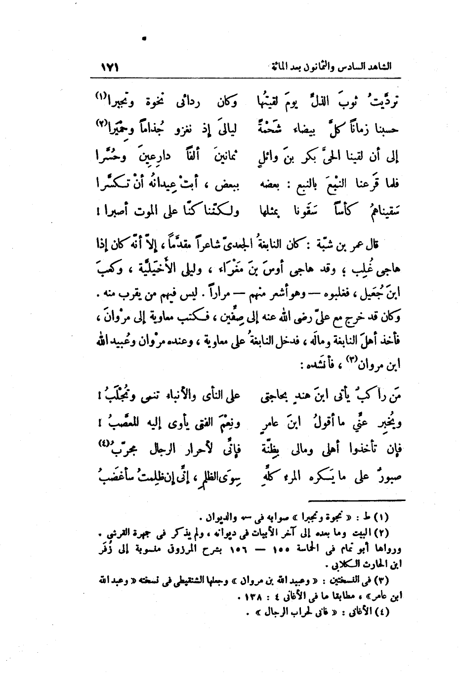 لَيْسَ فيهم من يقرب مِنْهُ. وَكَانَ قد خرج مَعَ عَليّ رَضِيَ اللَّهُ عَنْه إِلَى صفّين فَكتب مُعَاوِيَة إِلَى مَرْوَان فَأخذ أهل النَّابِغَة وَمَاله فَدخل النَّابِغَة على مُعَاوِيَة وَعِنْده مَرْوَان وَعبيد الله بن مَرْوَان)