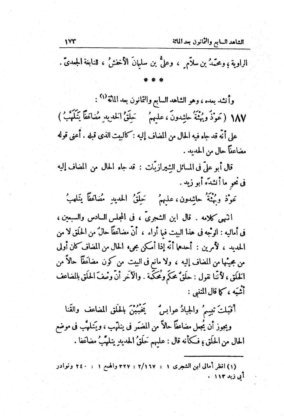 قَالَ ابْن الشجري فِي الْمجْلس السَّادِس وَالسبْعين فِي أَمَالِيهِ: الْوَجْه فِي هَذَا الْبَيْت فِيمَا أرَاهُ أَن مضاعفاً حَال من الْحلق لَا من الْحَدِيد لأمرين: أَحدهمَا: أَنه إِذا أمكن مَجِيء الْحَال من الْمُضَاف كَانَ أولى من مجيئها من الْمُضَاف إِلَيْهِ وَلَا مَانع فِي الْبَيْت من كَون مضاعفاً حَالا من الْحلق لأننا نقُول: حلق مُحكم ومحكمة.