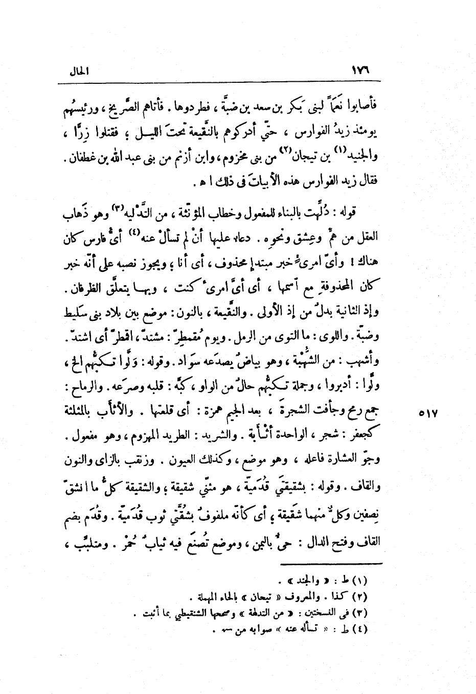 الأولى. والنقيعة بالنُّون: مَوضِع بَين بِلَاد بني سليط وضبة. واللوى: مَا التوى من الرمل. وَيَوْم مقمطرّ: مشتدّ اقمطرّ أَي: اشتدّ. وَأَشْهَب: من الشهبة وَهُوَ بَيَاض يصدعه سَواد. وَقَوله: ولّوا تكبهم الخ ولّوا: ادبروا وَجُمْلَة تكبهم حَال من الْوَاو كبّه: قلبه وصرعه. والرماح: جمع رمح. وجأفت الشَّجَرَة بعد الْجِيم همزَة أَي: قلعتها. والأثأب بِالْمُثَلثَةِ كجعفر: شجر الْوَاحِدَة أثأبة. والشريد: الطريد الْمَهْزُوم وَهُوَ مفعول. وجوّ العشارة فَاعله وَهُوَ مَوضِع وَكَذَلِكَ الْعُيُون. وزنقب بالزاي وَالنُّون وَالْقَاف.