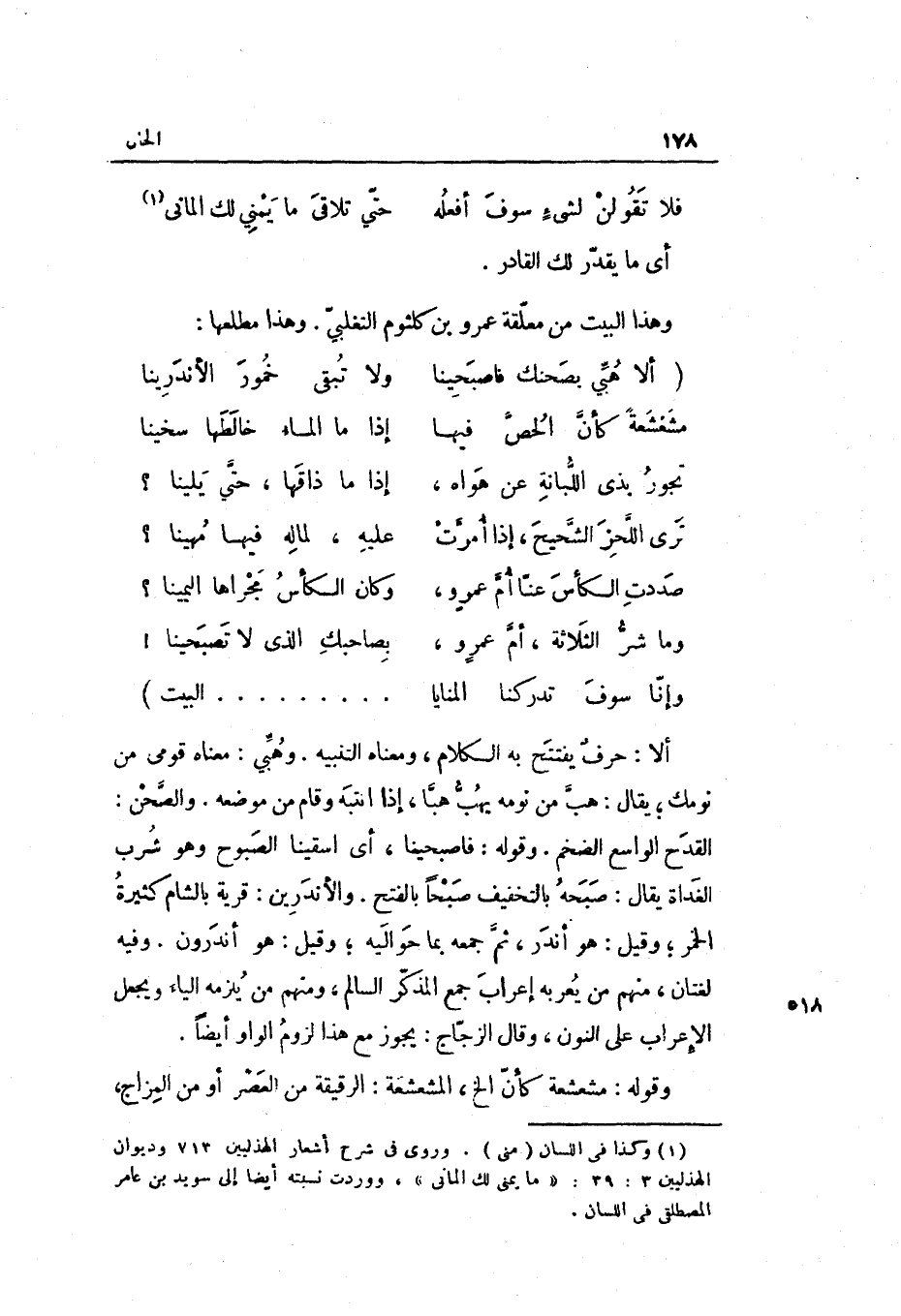 وَقَوله: فاصبحينا أَي: اسقينا الصبوح وَهُوَ شرب الْغَدَاة يُقَال: صبحه بِالتَّخْفِيفِ صبحاً بِالْفَتْح. والأندرين: قَرْيَة بِالشَّام كَثِيرَة الْخمر وَقيل: هُوَ أندر ثمَّ جمعه بِمَا حواليه وَقيل: هُوَ أندرون. وَفِيه لُغَتَانِ مِنْهُم من يعربه إِعْرَاب جمع الْمُذكر السَّالِم وَمِنْهُم من يلْزمه الْيَاء وَيجْعَل الْإِعْرَاب على النُّون وَقَالَ الزجّاج: يجوز مَعَ هَذَا لُزُوم الْوَاو أَيْضا.
