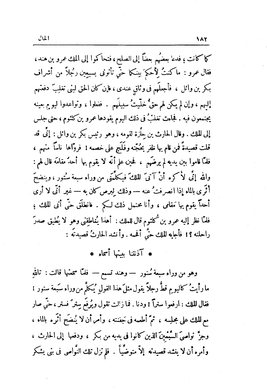 بهَا أحد مقَامه قَالَ لَهُم: وَالله إِنِّي لأكْره أَن آتِي الْملك فيكلمني من وَرَاء سَبْعَة ستور وينضح أثري بِالْمَاءِ إِذا انصرفت عَنهُ وَذَلِكَ لبرص كَانَ بِهِ غير أَنِّي لَا أرى أحدا يقوم بهَا مقَامي وَأَنا مُحْتَمل ذَلِك لكم. فَانْطَلق حَتَّى أَتَى الْملك فَلَمَّا نظر إِلَيْهِ عَمْرو بن كُلْثُوم قَالَ للْملك: أَهَذا يناطقني وَهُوَ لَا يُطيق صدر رَاحِلَته فَأَجَابَهُ الْملك حَتَّى أَفْحَمَهُ.