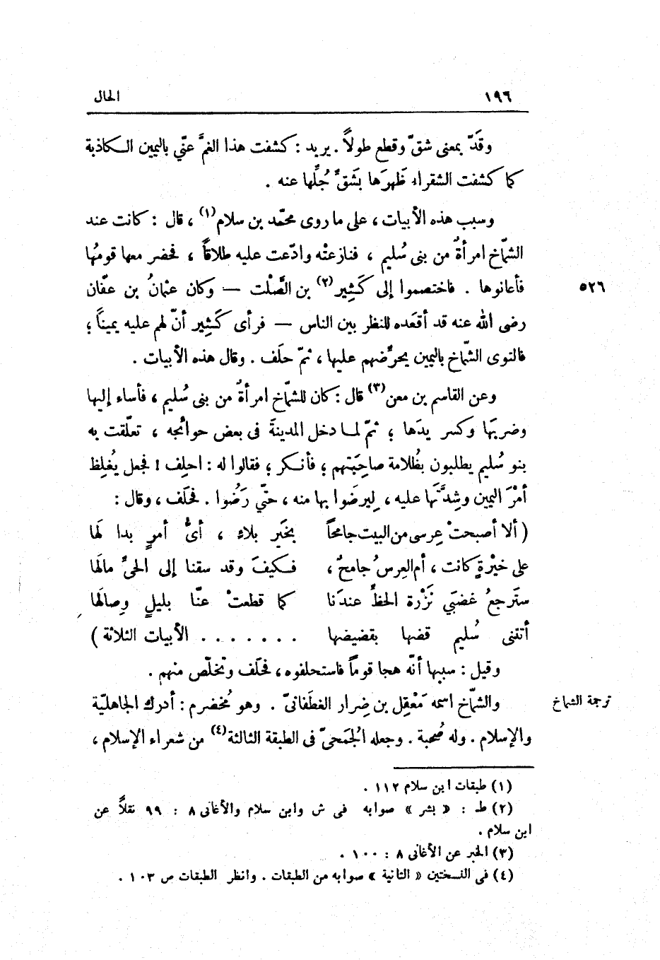 وَعَن الْقَاسِم بن معن قَالَ: كَانَ للشماخ امْرَأَة من بني سليم فأساء إِلَيْهَا وضربها وَكسر يَدهَا ثمَّ لما دخل الْمَدِينَة فِي بعض حَوَائِجه تعلّقت بِهِ بَنو سليم يطْلبُونَ بظلامة صاحبتهم فَأنْكر فَقَالُوا لَهُ: احْلِف فَجعل يغلظ أَمر الْيَمين وشدتها عَلَيْهِ ليرضوا بهَا مِنْهُ حَتَّى رَضوا. فَحلف وَقَالَ:
