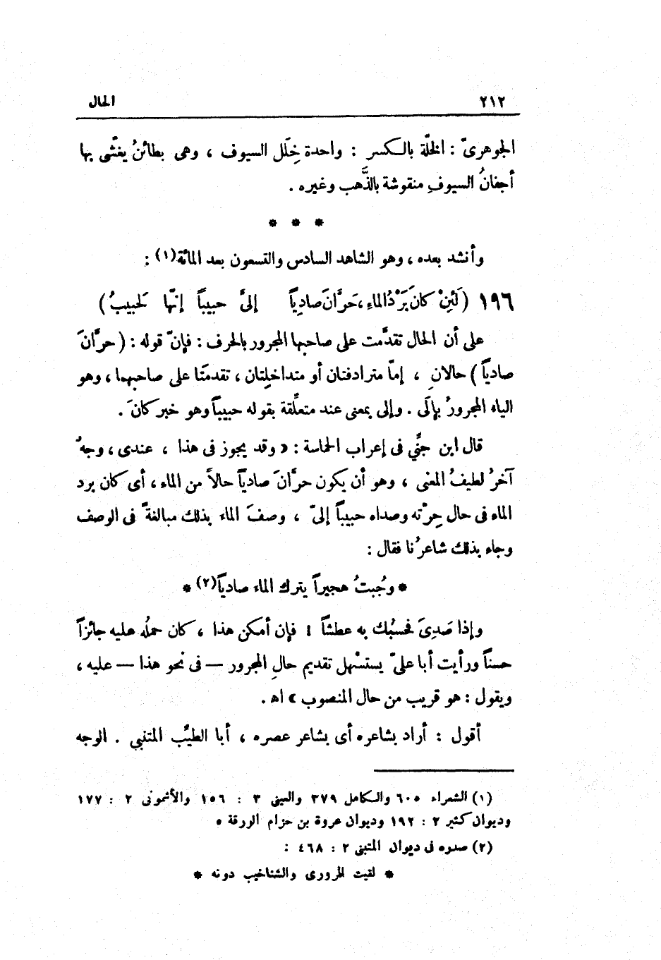 الشَّاهِد السَّادِس وَالتِّسْعُونَ بعد الْمِائَة على أَن الْحَال تقدّمت على صَاحبهَا الْمَجْرُور بالحرف: فَإِن قَوْله: حرّان صادياً حالان إِمَّا مُتَرَادِفَانِ أَو متداخلتان تقدمتا على صَاحبهمَا وَهُوَ الْيَاء الْمَجْرُور بإلي. وإليّ: بِمَعْنى عِنْد مُتَعَلقَة بقوله حبيباً وَهُوَ خبر كَانَ.