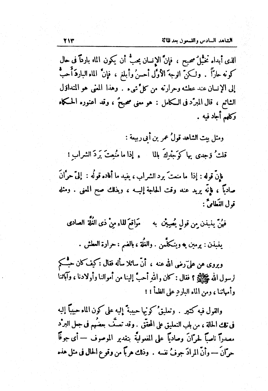 الَّذِي أبداه تخيّل صَحِيح فَإِن الْإِنْسَان يحب أَن يكون المَاء بَارِدًا فِي جال كَونه حاراً. وَلَكِن الْوَجْه الأول أحسن وأبلغ فَإِن المَاء الْبَارِد أحب إِلَى الْإِنْسَان عِنْد عطشه وحرارته من كل شَيْء. وَهَذَا الْمَعْنى هُوَ المتداول الشَّائِع قَالَ المبرّد فِي الْكَامِل: هُوَ معنى صَحِيح وَقد اعتوره الْحُكَمَاء وَكلهمْ أَجَاد فِيهِ.