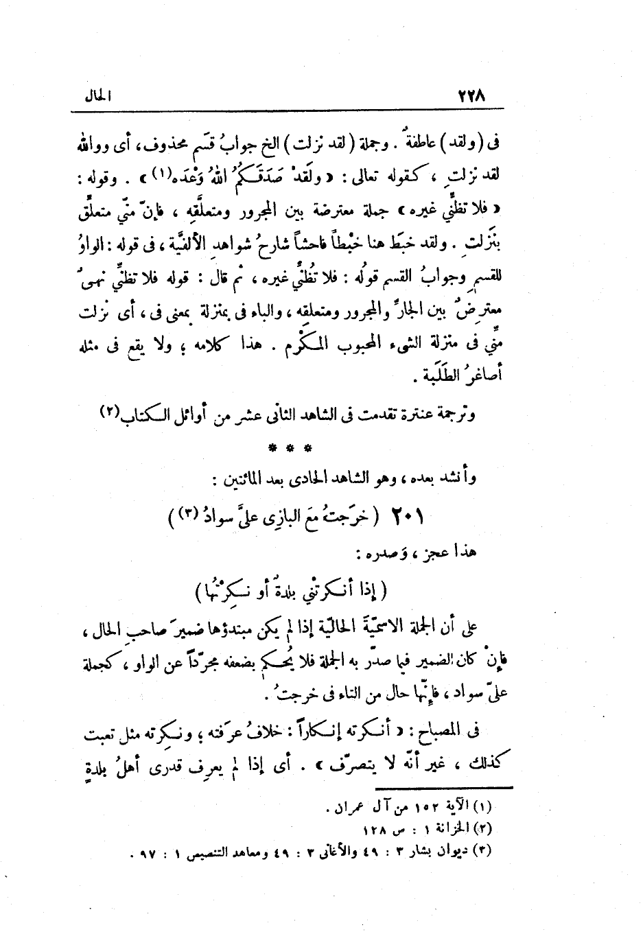 الشَّاهِد الْوَاحِد بعد الْمِائَتَيْنِ خرجت مَعَ البازيّ عليّ سَواد هَذَا عجز وصدره: إِذا أنكرتني بَلْدَة أَو نكرتها