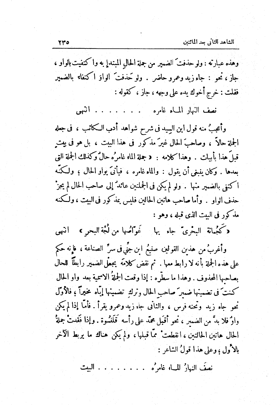 وَهَذِه عِبَارَته: وَلَو حذفت الضَّمِير من جملَة الْحَال الْمُبْتَدَأ بِهِ واكتفيت بِالْوَاو جَازَ نَحْو: جَاءَ زيد وَعَمْرو حَاضر. وَلَو حذفت الْوَاو اكْتِفَاء بالضمير فَقلت: خرج أَخُوك يَده على وَجهه جَازَ كَقَوْلِه: نصف النَّهَار المَاء غامره وأعجب مِنْهُ قَول ابْن السَّيِّد فِي شرح شَوَاهِد أدب الْكَاتِب فِي جعله الْجُمْلَة حَالا وَصَاحب الْحَال غير مَذْكُور فِي هَذَا الْبَيْت بل هُوَ فِي بَيت قبل هَذَا بِأَبْيَات. وَهَذَا كَلَامه: جملَة المَاء غامره حَال وَكَذَلِكَ الْجُمْلَة الَّتِي بعْدهَا. وَكَانَ يَنْبَغِي أَن يَقُول: وَالْمَاء غامره فَيَأْتِي بواو الْحَال وَلكنه اكْتفى بالضمير مِنْهَا. وَلَو لم يكن فِي الجملتين عَائِد إِلَى صَاحب الْحَال لم يجز حذف الْوَاو.