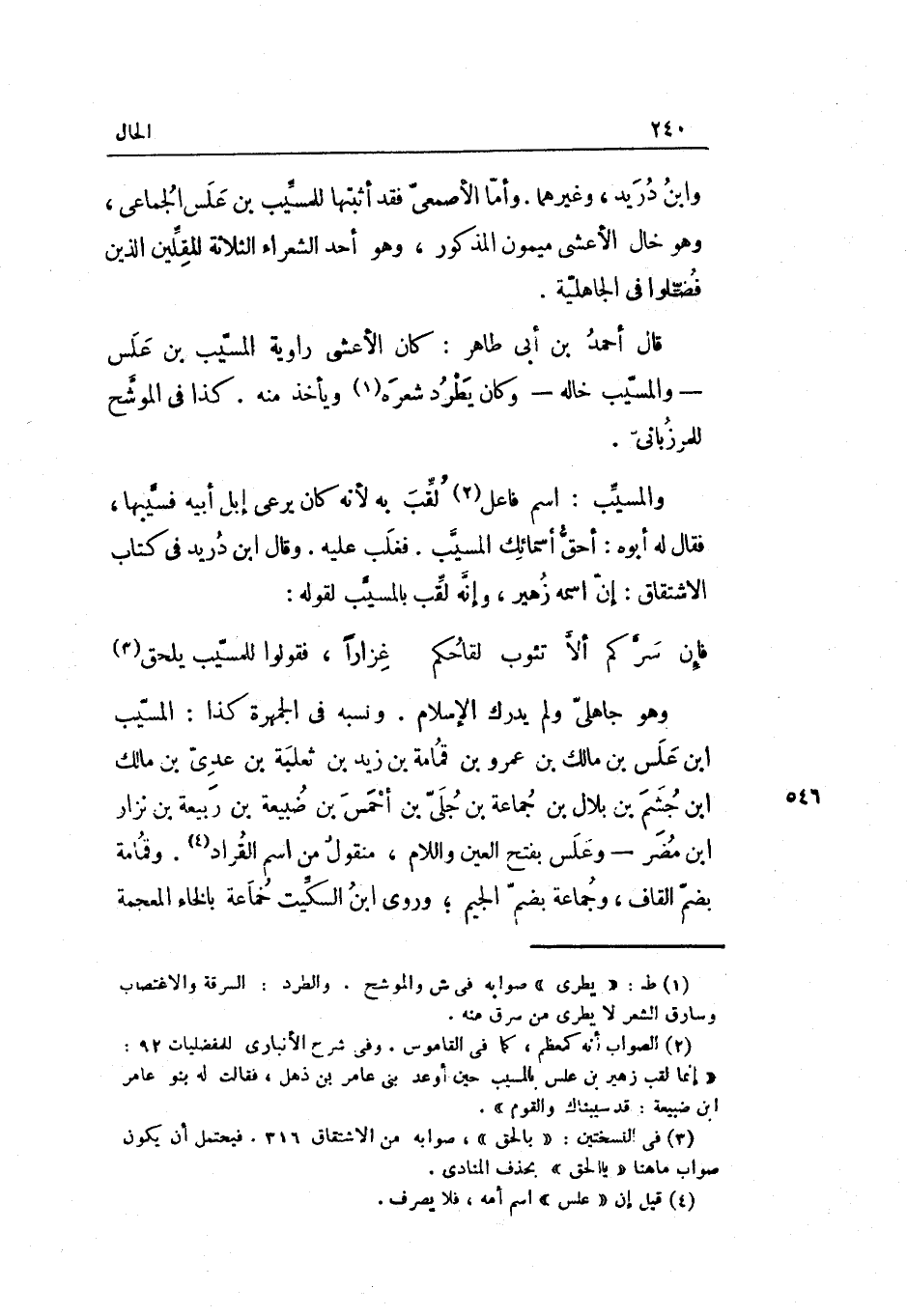 وَابْن دُرَيْد وَغَيرهمَا. وَأما الْأَصْمَعِي فقد أثبتها للمسيب بن علس الجماعيّ وَهُوَ خَال الْأَعْشَى مَيْمُون الْمَذْكُور. . وَهُوَ أحد الشُّعَرَاء الثَّلَاثَة المقلي الَّذين فضلوا فِي الْجَاهِلِيَّة.