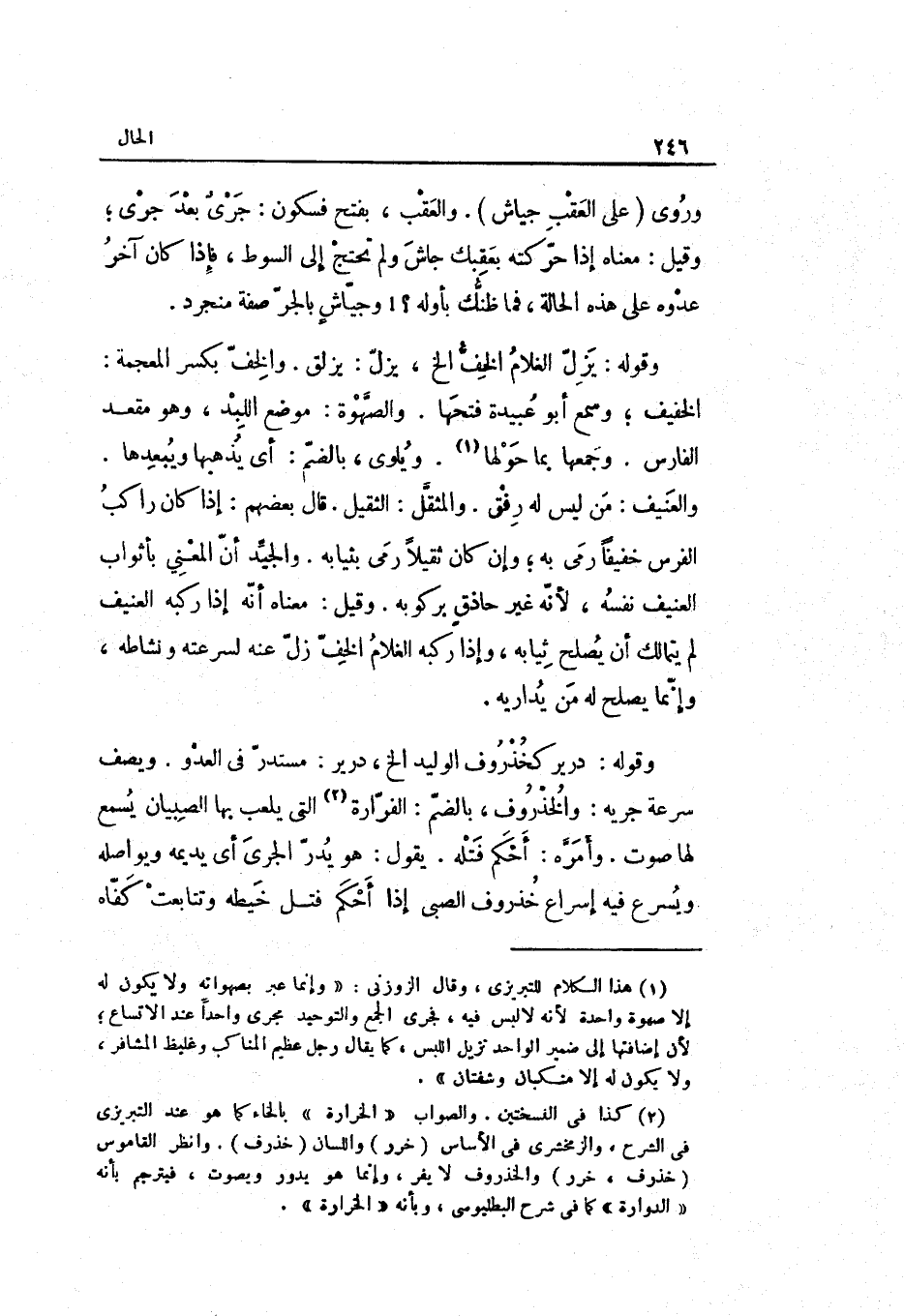 والخذروف بِالضَّمِّ: الخرّارة الَّتِي يلْعَب بهَا الصّبيان يسمع لَهَا صَوت. وأمرّه: احكم فتله. يَقُول: هُوَ يدرّ الجري أَي: يديمه ويواصله ويسرع فِيهِ إسراع خذروف الصَّبِي إِذا أحكم فتل خيطه وَتَتَابَعَتْ كفّاه