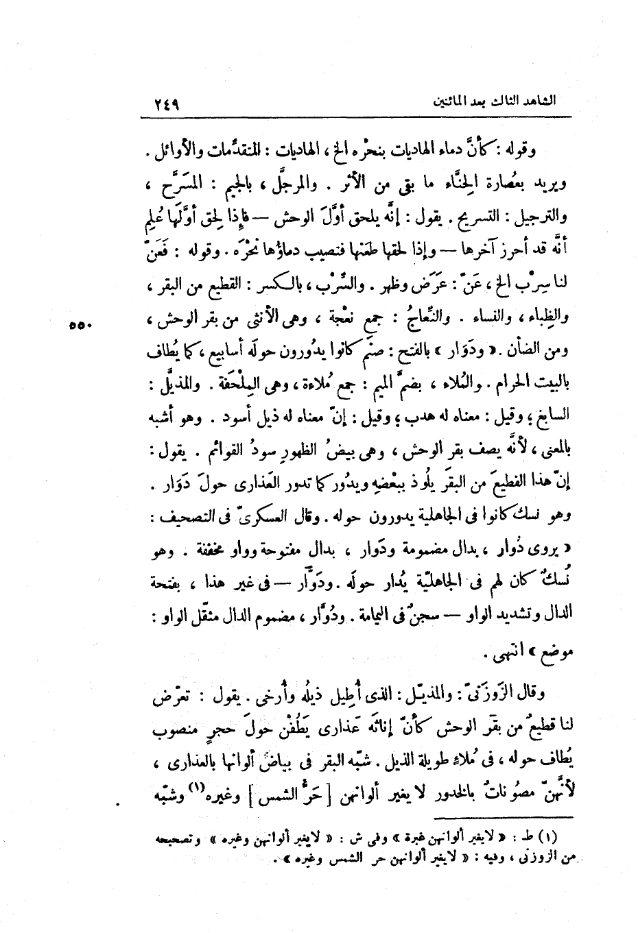 وَقَالَ الزوزني: المذيّل: الَّذِي أطيل ذيله وأرخي. يَقُول: تعرّض لنا قطيع من بقر الْوَحْش كَأَن إناثه عذارى يطفن حول حجر مَنْصُوب يُطَاف حوله فِي ملاء طَوِيلَة الذيل. شبّه الْبَقر فِي بَيَاض ألوانها بالعذارى لِأَنَّهُنَّ مصونات بالخدور لَا يُغير ألوانهن حرّ الشَّمْس وَغَيره وشبّه
