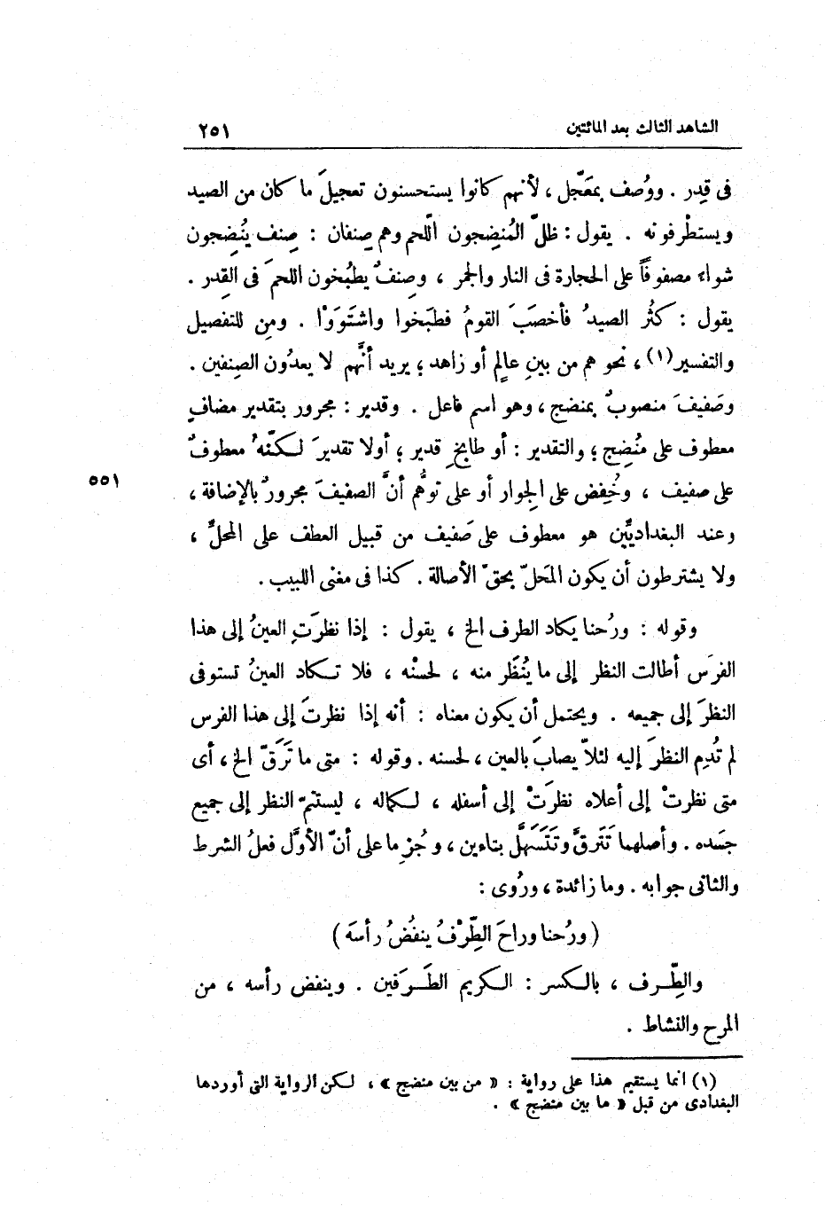 أَو طابخ قدير أَو لَا تَقْدِير لكنه مَعْطُوف على صفيف وخفض على الْجوَار أَو على توهم أَن الصفيف مجرور بِالْإِضَافَة وَعند البغداديين هُوَ مَعْطُوف على صفيف من قبيل الْعَطف على المحلّ وَلَا يشترطون أَن يكون المحلّ وَقَوله: ورحنا يكَاد الطّرف الخ يَقُول: إِذا نظرت الْعين إِلَى هَذَا الْفرس أَطَالَت النّظر إِلَى مَا ينظر مِنْهُ لحسنه فَلَا تكَاد الْعين تستوفي النّظر إِلَى جَمِيعه. وَيحْتَمل أَن يكون مَعْنَاهُ: أَنه إِذا نظرت إِلَى هَذَا الْفرس لم تدم النّظر إِلَيْهِ لِئَلَّا يصاب بِالْعينِ لحسنه.