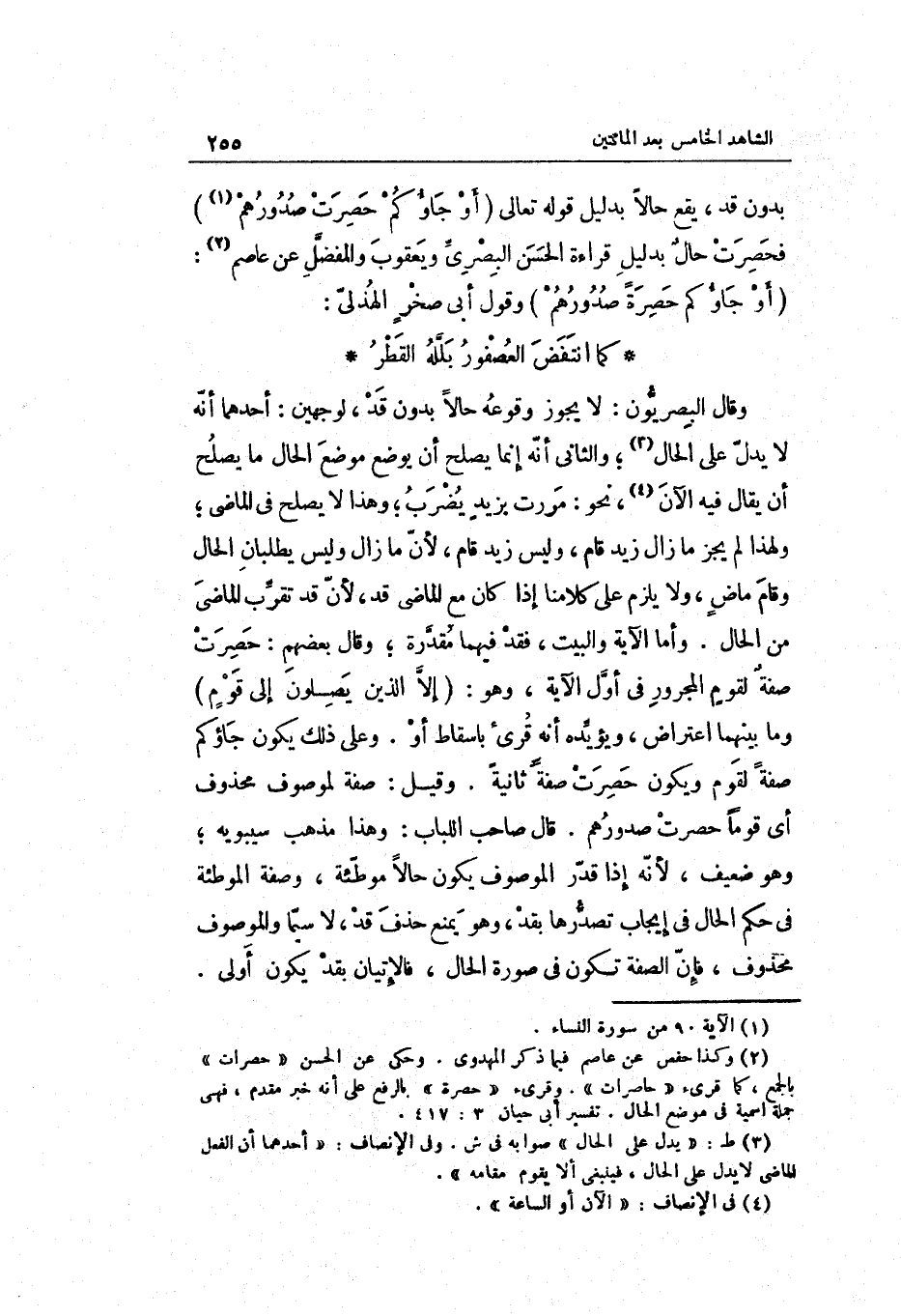 وَأما الْآيَة وَالْبَيْت فقد فيهمَا مقدرَة وَقَالَ بَعضهم: حصرت صفة لقوم الْمَجْرُور فِي أول الْآيَة وَهُوَ: إِلَّا الَّذين يصلونَ إِلَى قوم وَمَا بَينهمَا اعْتِرَاض وَيُؤَيِّدهُ أَنه قرئَ بِإِسْقَاط أَو. وعَلى ذَلِك يكون جاؤكم صفة لقوم وَيكون حصرت صفة ثَانِيَة. وَقيل: صفة لموصوف لمَحْذُوف أَي: قوما حصرت صُدُورهمْ.
