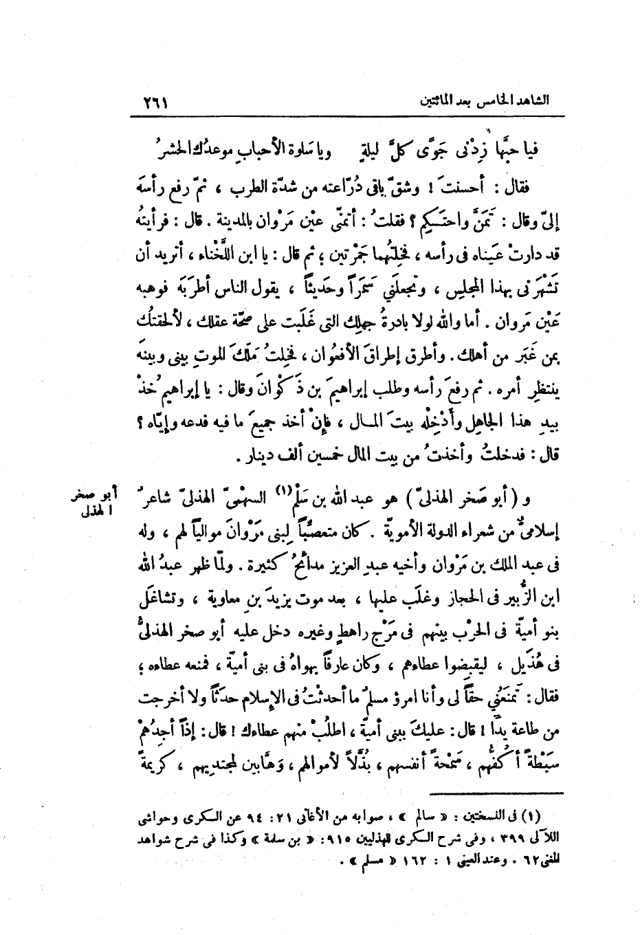 فَقَالَ: أَحْسَنت وشقّ بَاقِي درّاعته من شدَّة الطَّرب ثمَّ رفع رَأسه إليّ وَقَالَ: تمن واحتكم فَقلت: أَتَمَنَّى عين مَرْوَان بِالْمَدِينَةِ. قَالَ: فرأيته قد دارت عَيناهُ فِي رَأسه فخلتهما جمرتين ثمَّ قَالَ: يَا ابْن اللخناء اتريد أَن تشهرني بِهَذَا الْمجْلس وتجعلني سمراً وحديثاً يَقُول النَّاس أطربه فوهبه عين مَرْوَان. أما وَالله لَوْلَا بادرة جهلك الَّتِي غلبت على صِحَة عقلك لألحقتك بِمن غبر من اهلك. وأطرق إطراق الأفعوان فخلت ملك الْمَوْت بيني وَبَينه ينْتَظر أمره. ثمَّ رفع رَأسه وَطلب إِبْرَاهِيم بن ذكْوَان وَقَالَ: يَا إِبْرَاهِيم خُذ بيد هَذَا الْجَاهِل وَأدْخلهُ بَيت المَال فَإِن أَخذ جَمِيع مَا فِيهِ فَدَعْهُ وإياه قَالَ: فَدخلت وَأخذت من بَيت المَال خمسين ألف دِينَار. وأَبُو صَخْر الْهُذلِيّ هُوَ عبد الله بن سَالم السَّهْمِي الْهُذلِيّ شَاعِر إسلامي من شعراء الدولة الأموية. كَانَ متعصباً لبني مَرْوَان موالياً لَهُم وَله فِي عبد الْملك بن مَرْوَان وأخيه عبد الْعَزِيز مدائح كَثِيرَة. ولمّا ظهر عبد الله بن الزبير فِي الْحجاز وَغلب عَلَيْهَا بعد موت يزِيد بن مُعَاوِيَة وتشاغل بَنو أُميَّة فِي الْحَرْب بَينهم فِي مرج راهط وَغَيره دخل عَلَيْهِ أَبُو صَخْر الْهُذلِيّ فِي هُذَيْل ليقبضوا عطاءهم وَكَانَ عَارِفًا بهواه فِي بني أُميَّة فَمَنعه عطاءه فَقَالَ: تمنعني حَقًا لي وَأَنا امْرُؤ مُسلم مَا أحدثت فِي الْإِسْلَام حَدثا وَلَا أخرجت من طَاعَة يدا قَالَ: عَلَيْك ببني أُميَّة اطلب مِنْهُم عطاءك قَالَ: إِذا أجدهم سبطة أكفهم سَمْحَة أنفسهم بذلاً لأموالهم وهّابين لمجتديهم كَرِيمَة