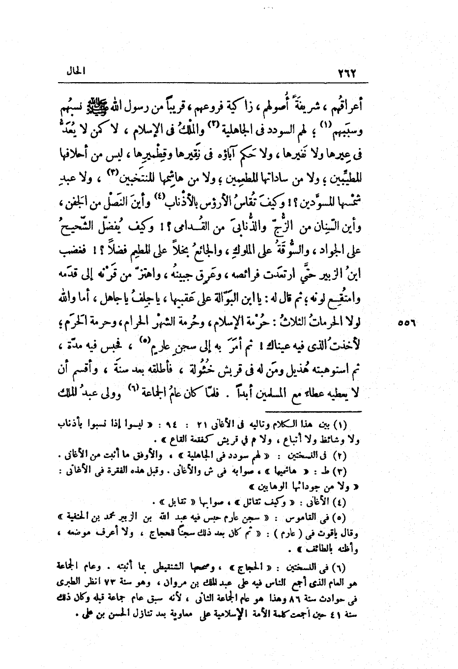 أعراقهم شريفة أصولهم زاكية فروعهم قَرِيبا من رَسُول الله صَلَّى اللَّهُ عَلَيْهِ وَسَلَّم َ نسبهم وسببهم لَيْسُوا إِذا نسبوا بأذناب وَلَا وشائظ وَلَا أَتبَاع وَلَا هم فِي قُرَيْش كفقعة القاع لَهُم السودد فِي الْجَاهِلِيَّة وَالْملك فِي الْإِسْلَام لَا كمن لَا يعدّ فِي عيرها وَلَا نفيرها وَلَا حكم آباؤه فِي نقيرها وقطميرها لَيْسَ من أحلافها المطيّبين وَلَا من ساداتها المطعمين وَلَا من هاشمها المنتخبين وَلَا عبد شمسها المسوّدين وَكَيف تقاس الأرؤس بالأذناب وَأَيْنَ النصل من الجفن وَأَيْنَ السنان من الزجّ والذنابى من القدامى وَكَيف يفضل الشحيح على الْجواد والسوقة على الْمُلُوك والجائع بخلا على الْمطعم فضلا فَغَضب بن الزبير حَتَّى ارتعدت فرائصه وعرق جَبينه واهتز من قرنه إِلَى قدمه وامتقع لَونه ثمَّ قَالَ لَهُ: يَا ابْن البوّالة على عقبيها يَا جلف يَا جَاهِل أما وَالله لَوْلَا الحرمات الثَّلَاث: حُرْمَة الْإِسْلَام وَحُرْمَة الشَّهْر الْحَرَام وَحُرْمَة الْحرم لأخذت الَّذِي فِيهِ عَيْنَاك ثمَّ أَمر بِهِ إِلَى سجن عَارِم فحبس فِيهِ مدّة ثمَّ استوهبته هُذَيْل وَمن)